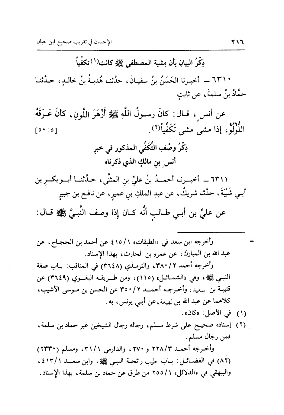6310 - أَخْبَرَنَا الْحَسَنُ بْنُ سُفْيَانَ، حَدَّثَنَا هُدْبَةُ بْنُ خَالِدٍ، حَدَّثَنَا حَمَّادُ بْنُ سَلَمَةَ، عَنْ ثَابِتٍ، عَنْ أَنَسٍ، قَالَ: «كَانَ رَسُولُ اللَّهِ صَلَّى اللَّهُ عَلَيْهِ وَسَلَّمَ أَزْهَرَ اللَّوْنِ كَأَنَّ عَرَقَهُ اللُّؤْلُؤُ، إِذَا مَشَى مَشَى تَكَفِّيًا» (2) . [5: 50]