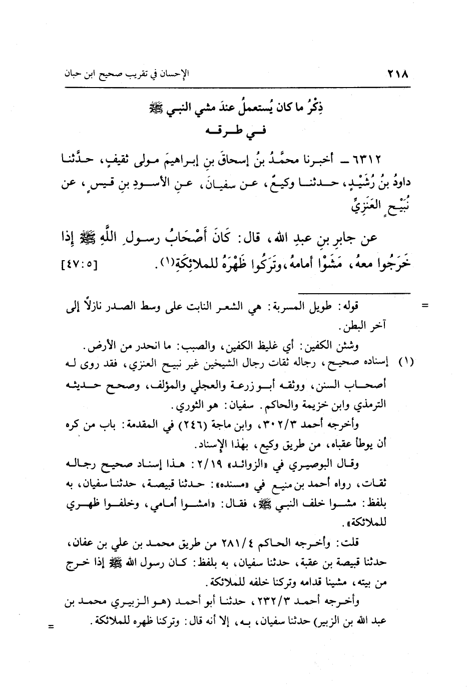 6312 - أَخْبَرَنَا مُحَمَّدُ بْنُ إِسْحَاقَ بْنِ إِبْرَاهِيمَ، مَوْلَى ثَقِيفٍ، حَدَّثَنَا دَاوُدُ بْنُ رُشَيْدٍ، حَدَّثَنَا وَكِيعٌ، عَنْ سُفْيَانَ، عَنِ الْأَسْوَدِ بْنِ قَيْسٍ، عَنْ نُبَيْحٍ الْعَنَزِيِّ، عَنْ جَابِرِ بْنِ عَبْدِ اللَّهِ، قَالَ: «كَانَ أَصْحَابُ رَسُولِ اللَّهِ صَلَّى اللَّهُ عَلَيْهِ وَسَلَّمَ إِذَا خَرَجُوا مَعَهُ مَشَوْا أَمَامَهُ، وَتَرَكُوا ظَهْرَهُ لِلْمَلَائِكَةِ» (1) . [5: 47]