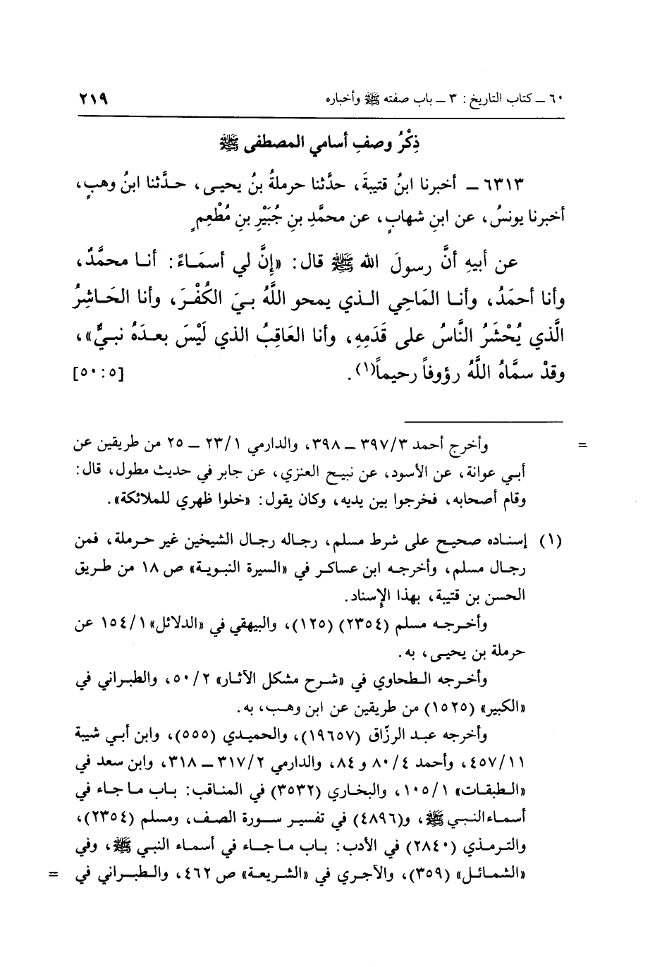 6313 - أَخْبَرَنَا ابْنُ قُتَيْبَةَ، حَدَّثَنَا حَرْمَلَةُ بْنُ يَحْيَى، حَدَّثَنَا ابْنُ وَهْبٍ، أَخْبَرَنَا يُونُسُ، عَنِ ابْنِ شِهَابٍ، عَنْ مُحَمَّدِ بْنِ جُبَيْرِ بْنِ مُطْعِمٍ، عَنْ أَبِيهِ، أَنَّ رَسُولَ اللَّهِ صَلَّى اللَّهُ عَلَيْهِ وَسَلَّمَ، قَالَ: «إِنَّ لِي أَسْمَاءً: أَنَا مُحَمَّدٌ، وَأَنَا أَحْمَدُ، وَأَنَا الْمَاحِي الَّذِي يَمْحُو اللَّهُ بِيَ الْكُفْرَ، وَأَنَا الْحَاشِرُ الَّذِي يُحْشَرُ النَّاسُ عَلَى قَدَمِهِ، وَأَنَا الْعَاقِبُ الَّذِي لَيْسَ بَعْدَهُ نَبِيٌّ» ، وَقَدْ سَمَّاهُ اللَّهُ رَءُوفًا رَحِيمًا (1) . [5: 50]