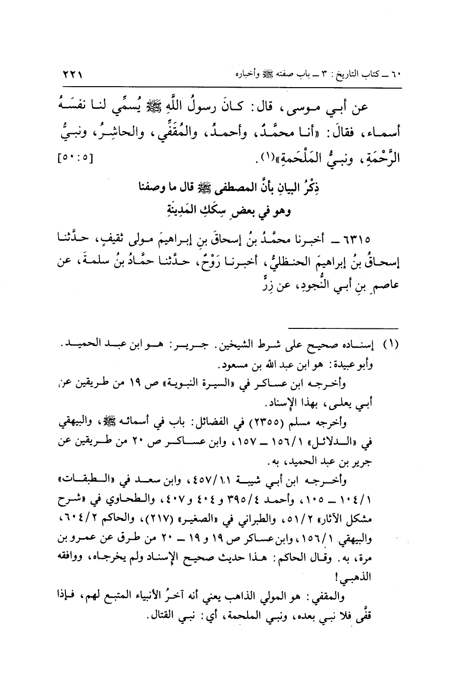 عَنْ أَبِي مُوسَى، قَالَ: كَانَ رَسُولُ اللَّهِ صَلَّى اللَّهُ عَلَيْهِ وَسَلَّمَ، يُسَمِّي لَنَا نَفْسَهُ أَسْمَاءً، فَقَالَ: «أَنَا مُحَمَّدٌ، وَأَحْمَدُ، وَالْمُقَفِّي، وَالْحَاشِرُ، وَنَبِيُّ الرَّحْمَةِ، وَنَبِيُّ الْمَلْحَمَةِ» (1) . [5: 50]