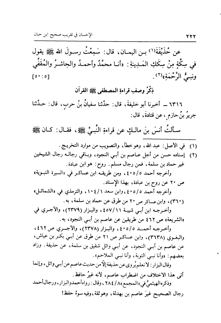 عَنْ حُذَيْفَةَ بْنِ الْيَمَانِ، قَالَ: سَمِعْتُ رَسُولَ اللَّهِ صَلَّى اللَّهُ عَلَيْهِ وَسَلَّمَ يَقُولُ فِي سِكَّةٍ مِنْ سِكَكِ الْمَدِينَةِ: «أَنَا مُحَمَّدٌ، وَأَحْمَدُ، وَالْحَاشِرُ، وَالْمُقَفِّي، وَنَبِيُّ الرَّحْمَةِ» (2) . [5: 50]