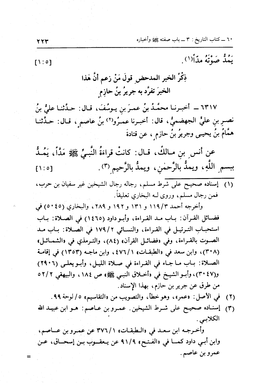 6317 - أَخْبَرَنَا مُحَمَّدُ بْنُ عُمَرَ بْنِ يُوسُفَ، قَالَ: حَدَّثَنَا عَلِيُّ بْنُ نَصْرِ بْنِ عَلِيٍّ الْجَهْضَمِيُّ، قَالَ: أَخْبَرَنَا عَمْرُو (2) بْنُ عَاصِمٍ، قَالَ: حَدَّثَنَا هَمَّامُ بْنُ يَحْيَى، وَجَرِيرُ بْنُ حَازِمٍ، عَنْ قَتَادَةَ، عَنْ أَنَسِ بْنِ مَالِكٍ، قَالَ: «كَانَتْ قِرَاءَةُ النَّبِيِّ صَلَّى اللَّهُ عَلَيْهِ وَسَلَّمَ مَدًّا يَمُدُّ بِبِسْمِ اللَّهِ، وَيَمُدُّ بِالرَّحْمَنِ، وَيَمُدُّ بِالرَّحِيمِ» (3) . [5: 1]