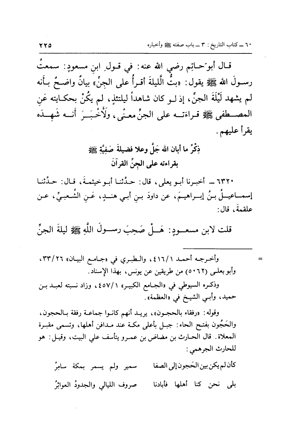 قَالَ أَبُو حَاتِمٍ رَضِيَ اللَّهُ عَنْهُ فِي قَوْلِ ابْنِ مَسْعُودٍ: «سَمِعْتُ رَسُولَ اللَّهِ صَلَّى اللَّهُ عَلَيْهِ وَسَلَّمَ يَقُولُ:» بِتُّ اللَّيْلَةَ أَقْرَأُ عَلَى الْجِنِّ «بَيَانٌ وَاضِحٌ بِأَنَّهُ لَمْ يَشْهَدْ لَيْلَةَ الْجِنِّ، إِذْ لَوْ كَانَ شَاهِدًا لَيْلَتَئِذٍ، لَمْ يَكُنْ بِحِكَايَتِهِ عَنِ الْمُصْطَفَى صَلَّى اللَّهُ عَلَيْهِ وَسَلَّمَ قِرَاءَتُهُ عَلَى الْجِنِّ مَعْنًى.