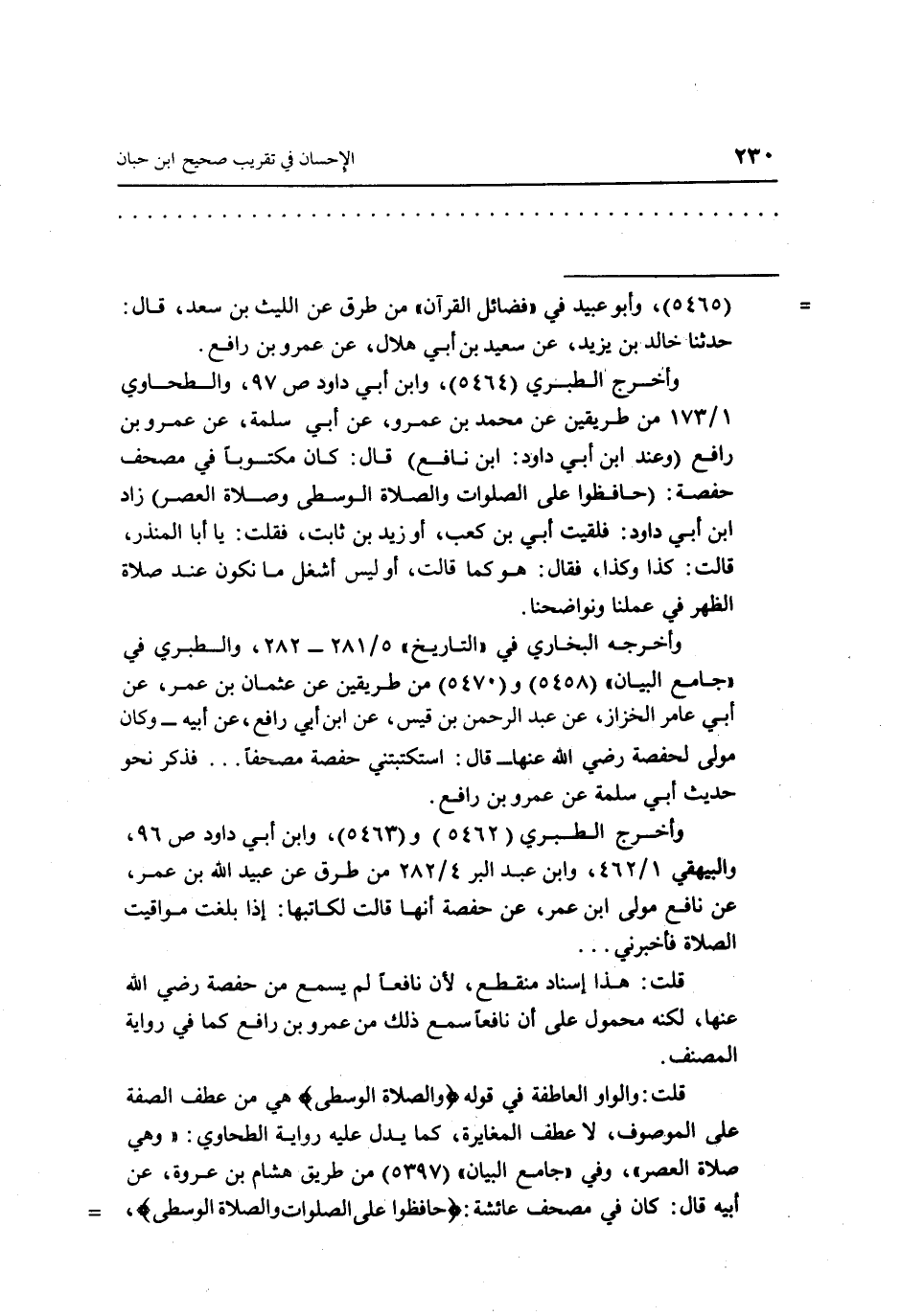 وأخرج الطبري (5464) ، وابن أبي داود ص 97، والطحاوي 1/173 من طريقين عن محمد بن عمرو، عن أبي سلمة، عن عمرو بن رافع (وعند ابن أبي داود: ابن نافع) قال: كان مكتوباً في مصحف حفصة: (حافظوا على الصلوات والصلاة الوسطى وصلاة العصر) زاد ابن أبي داود: فلقيت أبي بن كعب، أو زيد بن ثابت، فقلت: يا أبا المنذر، قالت: كذا وكذا، فقال: هو كما قالت، أو ليس أشغل ما نكون عند صلاة الظهر في عملنا ونواضحنا.