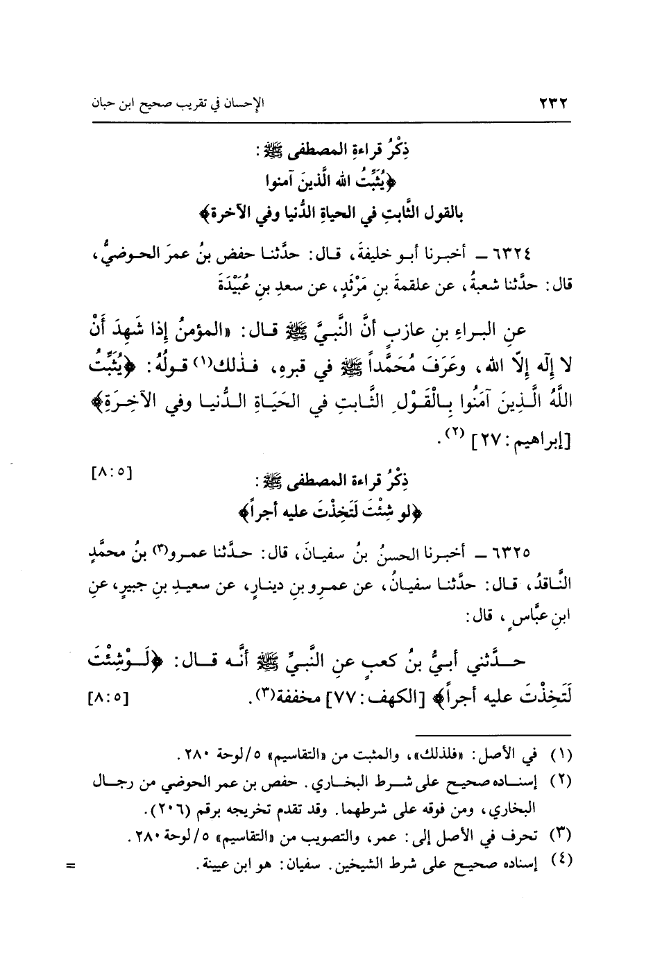 6325 - أَخْبَرَنَا الْحَسَنُ بْنُ سُفْيَانَ، قَالَ: حَدَّثَنَا عَمْرُو (3) بْنُ مُحَمَّدٍ النَّاقِدُ، قَالَ: حَدَّثَنَا سُفْيَانُ، عَنْ عَمْرِو بْنِ دِينَارٍ، عَنْ سَعِيدِ بْنِ جُبَيْرٍ، عَنِ ابْنِ عَبَّاسٍ، قَالَ: حَدَّثَنِي أُبَيُّ بْنُ كَعْبٍ، عَنِ النَّبِيِّ صَلَّى اللَّهُ عَلَيْهِ وَسَلَّمَ أَنَّهُ قَالَ: « (لَوْ شِئْتَ لَتَخِذْتَ عَلَيْهِ أَجْرًا) [الكهف: 77] مُخَفَّفَةً» (4) . [5: 8]