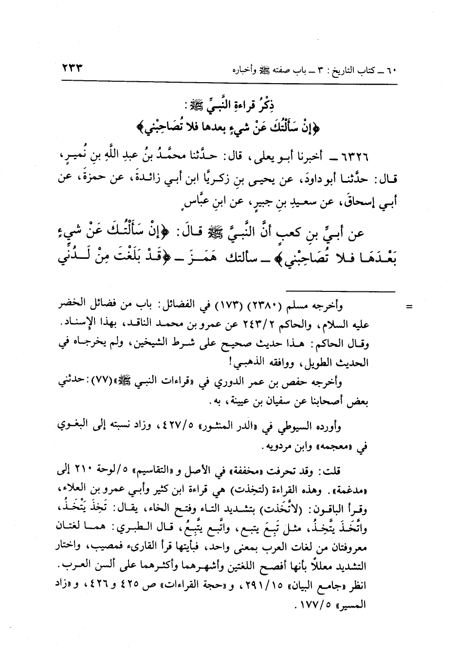 6326 - أَخْبَرَنَا أَبُو يَعْلَى، قَالَ: حَدَّثَنَا مُحَمَّدُ بْنُ عَبْدِ اللَّهِ بْنِ نُمَيْرٍ، قَالَ: حَدَّثَنَا أَبُو دَاوُدَ، عَنْ يَحْيَى بْنِ زَكَرِيَّا بْنِ أَبِي زَائِدَةَ، عَنْ حَمْزَةَ، عَنْ أَبِي إِسْحَاقَ، عَنْ سَعِيدِ بْنِ جُبَيْرٍ، عَنِ ابْنِ عَبَّاسٍ، عَنْ أُبَيِّ بْنِ كَعْبٍ، أَنَّ النَّبِيَّ صَلَّى اللَّهُ عَلَيْهِ وَسَلَّمَ قَالَ: « {إِنْ سَأَلْتُكَ عَنْ شَيْءٍ بَعْدَهَا فَلَا تُصَاحِبْنِي} [الكهف: 76]- سَأَلْتُكَ هَمَزَ - {قَدْ بَلَغْتَ مِنْ لَدُنِّي