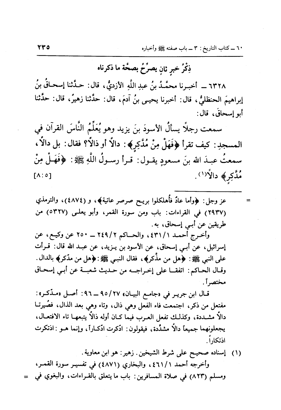 6328 - أَخْبَرَنَا مُحَمَّدُ بْنُ عَبْدِ اللَّهِ الْأَزْدِيُّ، قَالَ: حَدَّثَنَا إِسْحَاقُ بْنُ إِبْرَاهِيمَ الْحَنْظَلِيُّ، قَالَ: أَخْبَرَنَا يَحْيَى بْنُ آدَمَ، قَالَ: حَدَّثَنَا زُهَيْرٌ، قَالَ: حَدَّثَنَا أَبُو إِسْحَاقَ، قَالَ: سَمِعْتُ رَجُلًا يَسْأَلُ الْأَسْوَدَ بْنَ يَزِيدَ وَهُوَ يُعَلِّمُ النَّاسَ الْقُرْآنَ فِي الْمَسْجِدِ كَيْفَ تُقْرَأُ: {فَهَلْ مِنْ مُدَّكِرٍ} [القمر: 15] ، دَالًا أَوْ ذَالًا؟ فَقَالَ: بَلْ دَالًا، سَمِعْتُ عَبْدَ اللَّهِ بْنَ مَسْعُودٍ يَقُولُ: «قَرَأَ رَسُولُ اللَّهِ صَلَّى اللَّهُ عَلَيْهِ وَسَلَّمَ: {فَهَلْ مِنْ مُدَّكِرٍ} [القمر: 15] ، دَالًا» (1) . [5: 8]