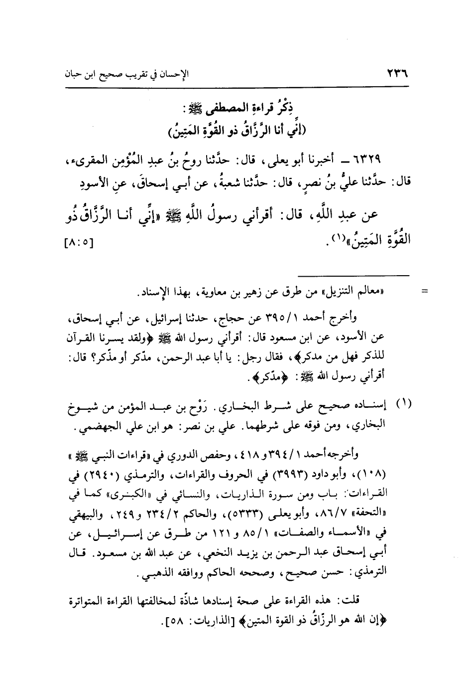 6329 - أَخْبَرَنَا أَبُو يَعْلَى، قَالَ: حَدَّثَنَا رَوْحُ بْنُ عَبْدِ الْمُؤْمِنِ الْمُقْرِئُ، قَالَ: حَدَّثَنَا عَلِيُّ بْنُ نَصْرٍ، قَالَ: حَدَّثَنَا شُعْبَةُ، عَنْ أَبِي إِسْحَاقَ، عَنِ الْأَسْوَدِ، عَنْ عَبْدِ اللَّهِ، قَالَ: «أَقْرَأَنِي رَسُولُ اللَّهِ صَلَّى اللَّهُ عَلَيْهِ وَسَلَّمَ:» إِنِّي أَنَا الرَّزَّاقُ ذُو الْقُوَّةِ الْمَتِين» (1) . [5: 8]