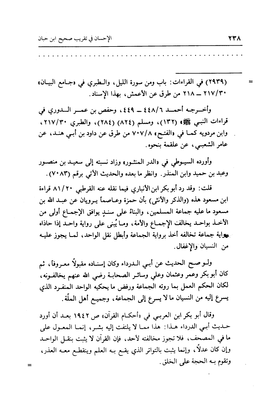وقال أبو بكر ابن العربي في "أحكام القرآن" ص 1942 بعد أن أورد حديث أبي الدرداء هذا: هذا مما لا يلتفت إليه بشر، إنما المعول على ما في المصحف، فلا تجوز مخالفته لأحد، فإن القرآن لا يثبت بنقل الواحد وإن كان عدلاً، وإنما يثبت بالتواتر الذي يقع به العلم وينقطع معه العذر، وتقوم به الحجة على الخلق. =