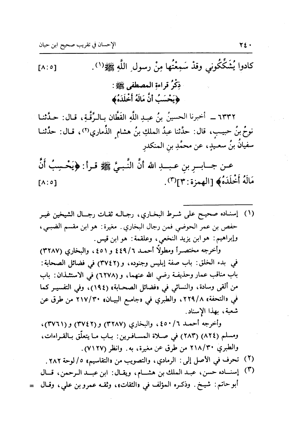 6332 - أَخْبَرَنَا الْحُسَيْنُ بْنُ عَبْدِ اللَّهِ الْقَطَّانُ، بِالرَّقَّةِ، قَالَ حَدَّثَنَا نُوحُ بْنُ حَبِيبٍ، قَالَ: حَدَّثَنَا عَبْدُ الْمَلِكِ بْنُ هِشَامٍ الذِّمَارِيُّ (2) ، قَالَ: حَدَّثَنَا سُفْيَانُ بْنُ سَعِيدٍ، عَنْ مُحَمَّدِ بْنِ الْمُنْكَدِرِ، عَنْ جَابِرِ بْنِ عَبْدِ اللَّهِ، «أَنَّ النَّبِيَّ صَلَّى اللَّهُ عَلَيْهِ وَسَلَّمَ قَرَأَ: {يَحْسَبُ أَنَّ مَالَهُ أَخْلَدَهُ} [الهمزة: 3] » (3) . [5: 8]