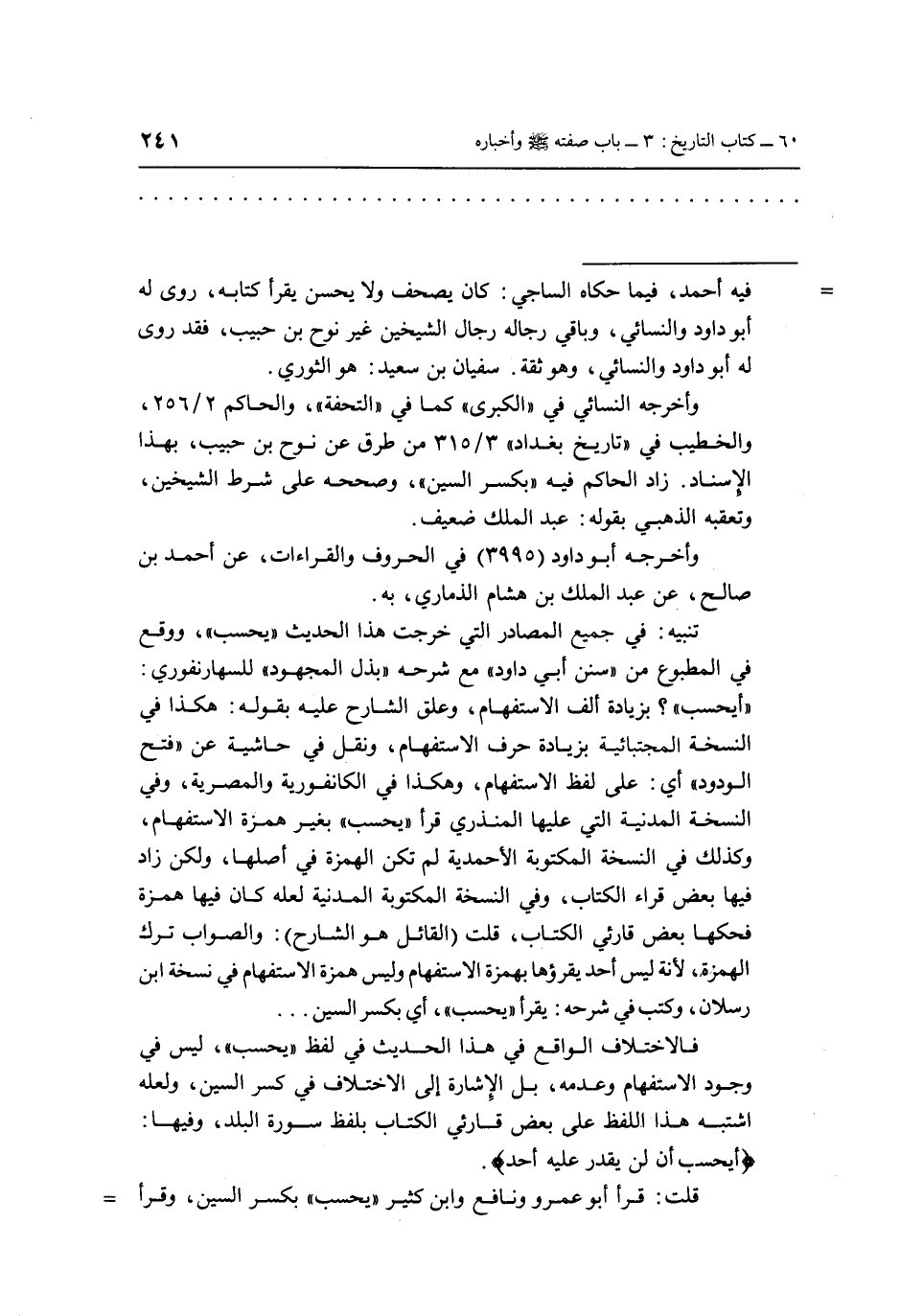 فالاختلاف الواقع في هذا الحديث في لفظ " يحسب "، ليس في وجود الاستفهام وعدمه، بل الإِشارة إلى الاختلاف في كسر السين، ولعله اشتبه هذا اللفظ على بعض قارئي الكتاب بلفظ سورة البلد، وفيها: {أيحسب أن لن يقدر عليه أحد} .