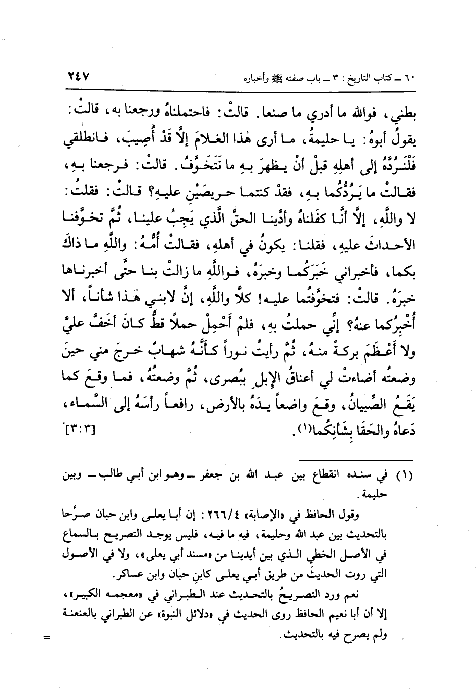 بَطْنِي، فَوَاللَّهِ، مَا أَدْرِي مَا صَنَعَا» ، قَالَتْ: فَاحْتَمَلْنَاهُ، وَرَجَعْنَا بِهِ، قَالَتْ: يَقُولُ أَبُوهُ: يَا حَلِيمَةُ مَا أَرَى هَذَا الْغُلَامَ إِلَّا قَدْ أُصِيبَ، فَانْطَلِقِي، فَلْنَرُدَّهُ إِلَى أَهْلِهِ قَبْلَ أَنْ يَظْهَرَ بِهِ مَا نَتَخَوَّفُ، قَالَتْ: فَرَجَعْنَا بِهِ، فَقَالَتْ: مَا يَرُدُّكُمَا بِهِ، فَقَدْ كُنْتُمَا حَرِيصَيْنِ عَلَيْهِ؟ قَالَتْ: فَقُلْتُ: لَا وَاللَّهِ، إِلَّا أَنَّا كَفَلْنَاهُ، وَأَدَّيْنَا الْحَقَّ الَّذِي يَجِبُ عَلَيْنَا، ثُمَّ تَخَوَّفْنَا الْأَحْدَاثَ عَلَيْهِ، فَقُلْنَا: يَكُونُ فِي أَهْلِهِ، فَقَالَتْ أُمُّهُ: وَاللَّهِ مَا ذَاكَ بِكُمَا، فَأَخْبِرَانِي خَبَرَكُمَا وَخَبَرَهُ، فَوَاللَّهِ مَا زَالَتْ بِنَا حَتَّى أَخْبَرْنَاهَا خَبَرَهُ، قَالَتْ: فَتَخَوَّفْتَمَا عَلَيْهِ، كَلَّا وَاللَّهِ، إِنَّ لِابْنِي هَذَا شَأْنًا، أَلَا أُخْبِرُكُمَا عَنْهُ إِنِّي حَمَلْتُ بِهِ، فَلَمْ أَحْمِلْ حَمْلًا قَطُّ، كَانَ أَخَفَّ عَلَيَّ، وَلَا أَعْظَمَ بَرَكَةً مِنْهُ، ثُمَّ رَأَيْتُ نُورًا كَأَنَّهُ شِهَابٌ خَرَجَ مِنِّي حِينَ وَضَعْتُهُ، أَضَاءَتْ لَهُ أَعْنَاقُ الْإِبِلِ بِبُصْرَى، ثُمَّ وَضَعْتُهُ، فَمَا وَقَعَ كَمَا يَقَعُ الصِّبْيَانُ، وَقَعَ وَاضِعًا يَدَهُ بِالْأَرْضِ، رَافِعًا رَأْسَهُ إِلَى السَّمَاءِ، دَعَاهُ وَالْحَقَا بِشَأْنِكُمَا (1) . [3: 3]