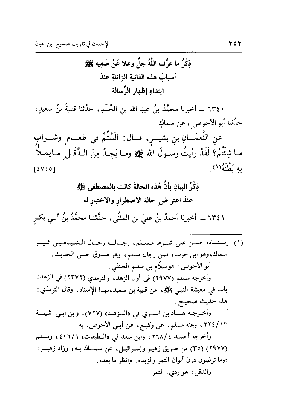 6340 - أَخْبَرَنَا مُحَمَّدُ بْنُ عَبْدِ اللَّهِ بْنِ الْجُنَيْدِ، حَدَّثَنَا قُتَيْبَةُ بْنُ سَعِيدٍ، حَدَّثَنَا أَبُو الْأَحْوَصِ، عَنْ سِمَاكٍ، عَنِ النُّعْمَانِ بْنِ بَشِيرٍ، قَالَ: «أَلَسْتُمْ فِي طَعَامٍ وَشَرَابٍ مَا شِئْتُمْ؟ .