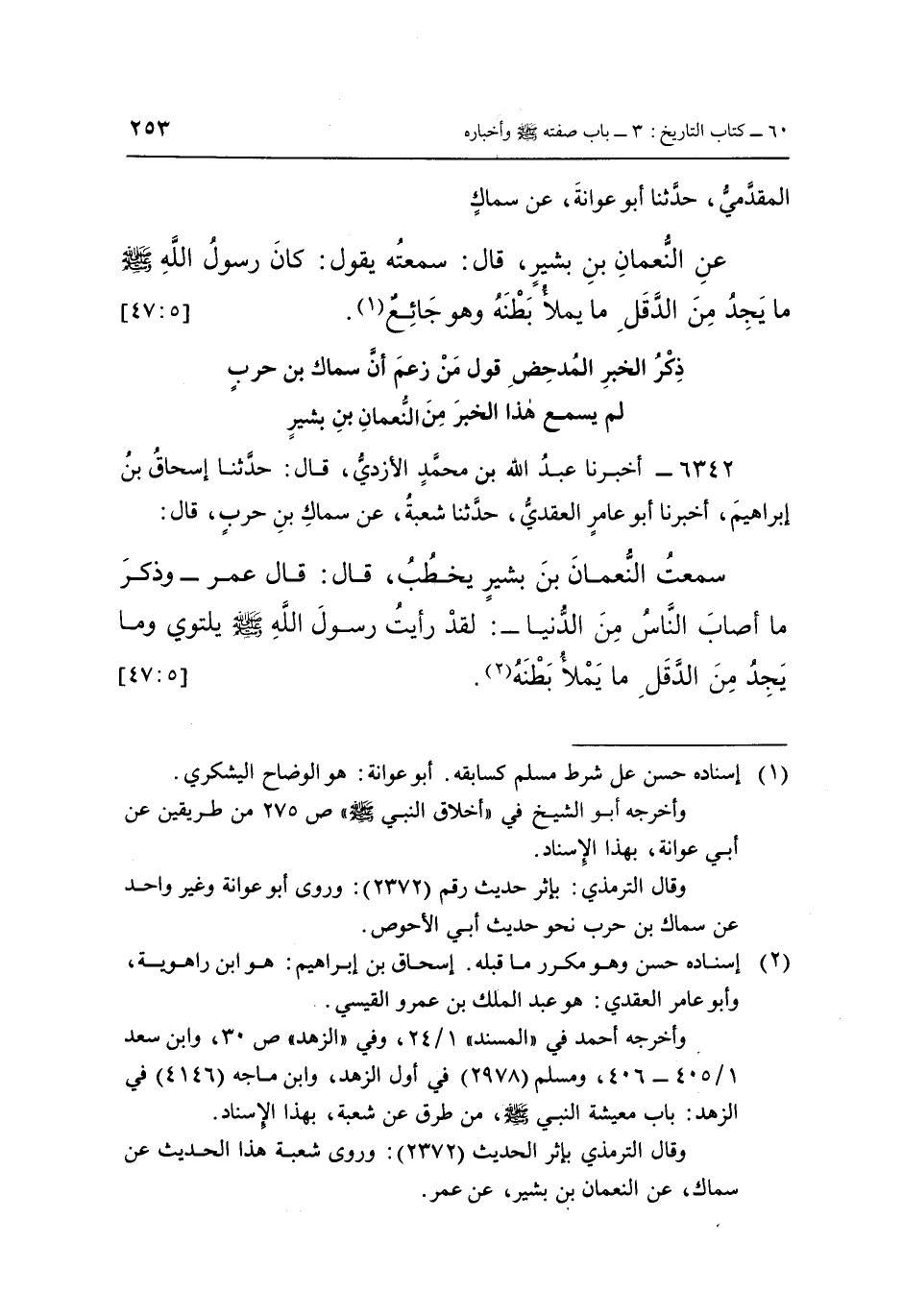 الْمُقَدَّمِيُّ، حَدَّثَنَا أَبُو عَوَانَةَ، عَنْ سِمَاكٍ، عَنِ النُّعْمَانِ بْنِ بَشِيرٍ، قَالَ: سَمِعْتُهُ يَقُولُ: «كَانَ رَسُولُ اللَّهِ صَلَّى اللَّهُ عَلَيْهِ وَسَلَّمَ مَا يَجِدُ مِنَ الدَّقَلِ مَا يَمْلَأُ بَطْنَهُ، وَهُوَ جَائِعٌ» (1) . [5: 47]