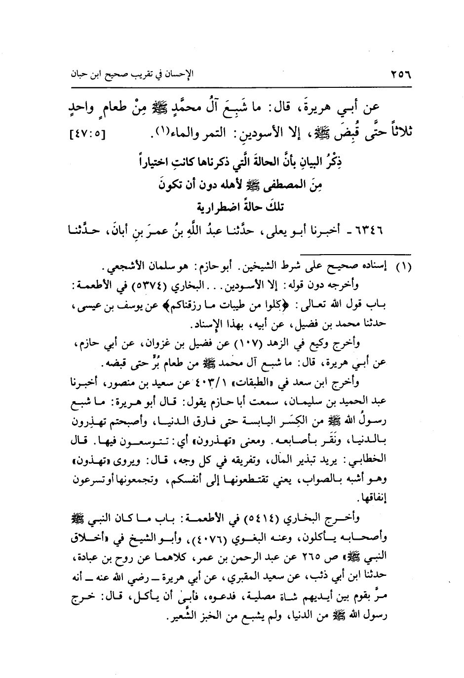 عَنْ أَبِي هُرَيْرَةَ، قَالَ: «مَا شَبِعَ آلُ مُحَمَّدٍ صَلَّى اللَّهُ عَلَيْهِ وَسَلَّمَ مِنْ طَعَامٍ وَاحِدٍ ثَلَاثًا حَتَّى قُبِضَ صَلَّى اللَّهُ عَلَيْهِ وَسَلَّمَ إِلَّا الْأَسْوَدَيْنِ: التَّمْرَ وَالْمَاءَ» (1) . [5: 47]