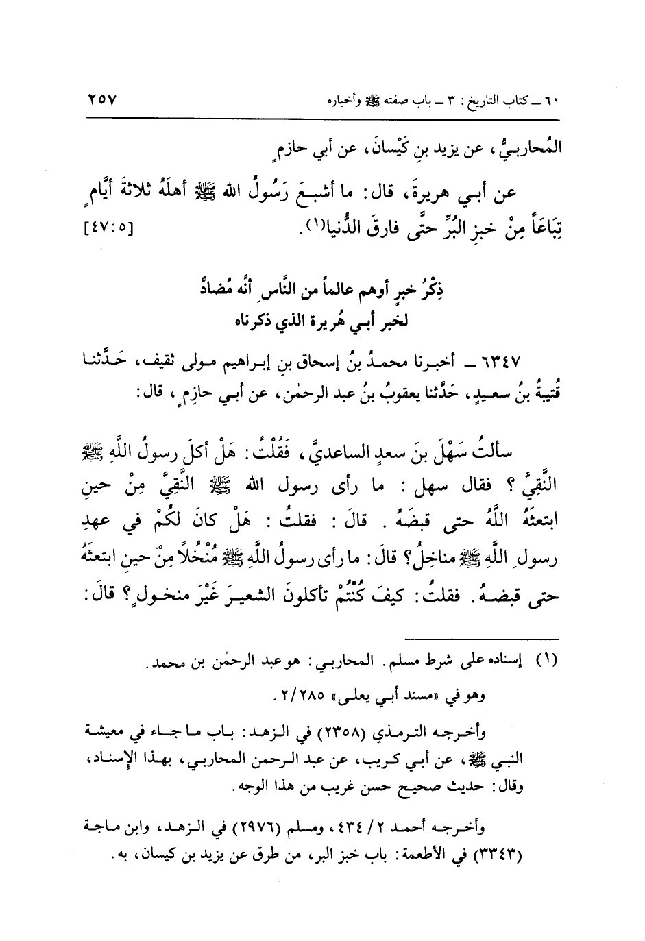 الْمُحَارِبِيُّ، عَنْ يَزِيدَ بْنِ كَيْسَانَ، عَنْ أَبِي حَازِمٍ، عَنْ أَبِي هُرَيْرَةَ، قَالَ: «مَا أَشْبَعَ رَسُولُ اللَّهِ صَلَّى اللَّهُ عَلَيْهِ وَسَلَّمَ أَهْلَهُ ثَلَاثَةَ أَيَّامٍ تِبَاعًا مِنْ خُبْزِ الْبُرِّ حَتَّى فَارَقَ الدُّنْيَا» (1) . [5: 47]