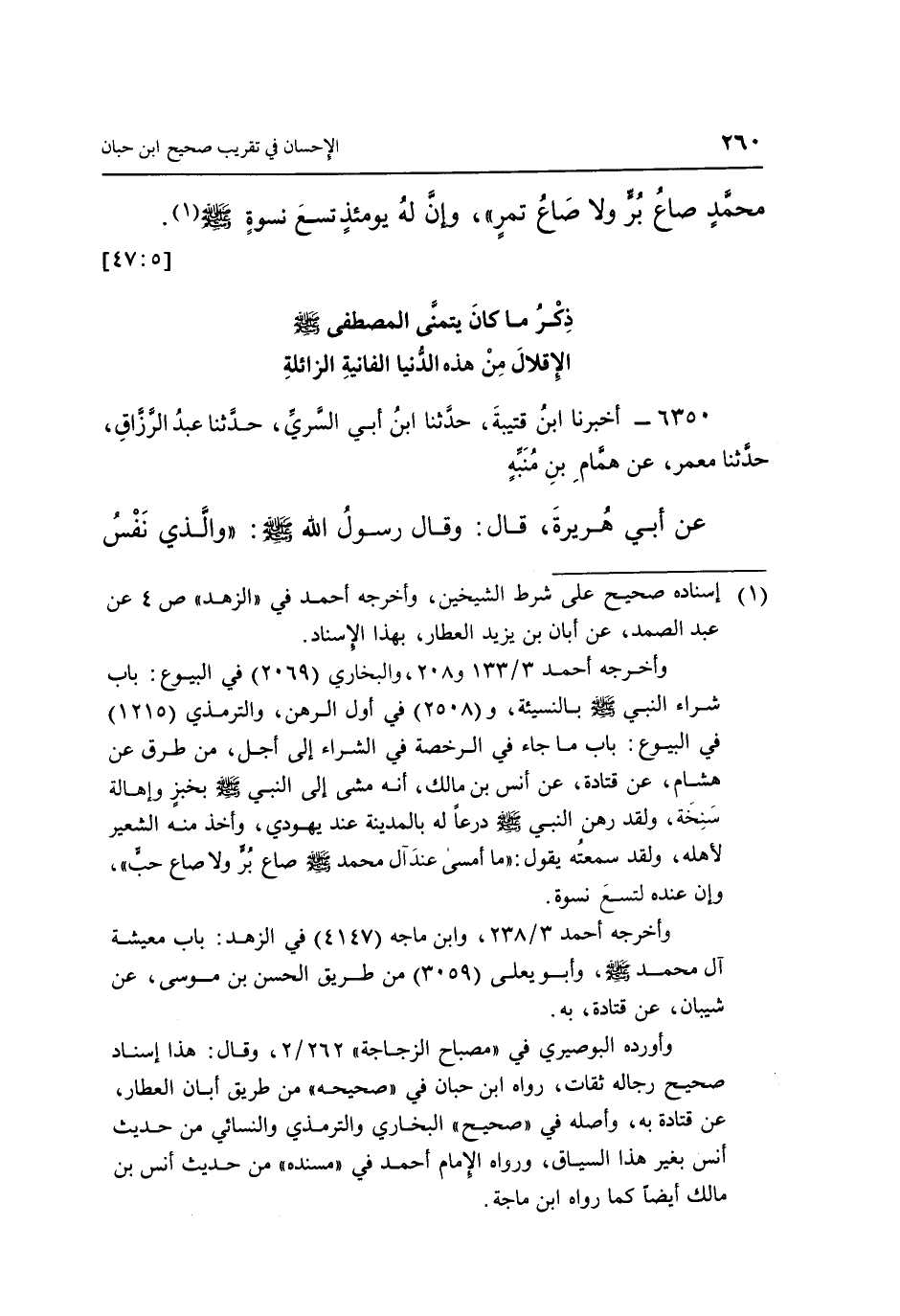 وأخرجه أحمد 3/133 و 208، والبخاري (2069) فى البيوع: باب شراء النبي - صلى الله عليه وسلم - بالنسيئة، و (2508) في أول الرهن، والترمذي (1215) في البيوع: باب ما جاء في الرخصة في الشراء إلى أجل، من طرق عَنْ هِشَامٍ، عَنْ قَتَادَةَ، عَنْ أَنَسِ بْنِ مالك، أنه مشى إلى النبي - صلى الله عليه وسلم - بخبزٍ وإهالة سَنِخَة، ولقد رهن النبي - صلى الله عليه وسلم - درعاً له بالمدينة عند يهودي، وأخذ منه الشعير لأهله، ولقد سمعتُه يقول: "ما أمسى عندَ آل محمد - صلى الله عليه وسلم - صاع بُرٍّ ولا صاع حبٍّ"، وإن عنده لتسعَ نسوة.