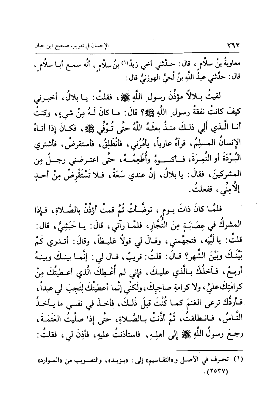 مُعَاوِيَةُ بْنُ سَلَّامٍ، قَالَ حَدَّثَنِي أَخِي زَيْدُ (1) بْنُ سَلَّامٍ، أَنَّهُ سَمِعَ أَبَا سَلَّامٍ، قَالَ: حَدَّثَنِي عَبْدُ اللَّهِ بْنُ لُحَيٍّ الْهَوْزَنِيُّ، قَالَ: لَقِيتُ بِلَالًا مُؤَذِّنَ رَسُولِ اللَّهِ صَلَّى اللَّهُ عَلَيْهِ وَسَلَّمَ، فَقُلْتُ: يَا بِلَالُ أَخْبِرْنِي كَيْفَ كَانَتْ نَفَقَةُ رَسُولِ اللَّهِ صَلَّى اللَّهُ عَلَيْهِ وَسَلَّمَ؟ قَالَ: مَا كَانَ لَهُ مِنْ شَيْءٍ، وَكُنْتُ أَنَا الَّذِي أَلِي ذَلِكَ مُنْذُ بَعَثَهُ اللَّهُ حَتَّى تُوُفِّيَ صَلَّى اللَّهُ عَلَيْهِ وَسَلَّمَ، فَكَانَ إِذَا أَتَاهُ الْإِنْسَانُ الْمُسْلِمُ فَرَآهُ عَارِيًا، يَأْمُرُنِي، فَأَنْطَلِقُ، فَأَسْتَقْرِضُ، فَأَشْتَرِي الْبُرْدَةَ أَوِ النَّمِرَةَ، فَأَكْسُوهُ، وَأُطْعِمُهُ، حَتَّى اعْتَرَضَنِي رَجُلٌ مِنَ الْمُشْرِكِينَ، فَقَالَ: يَا بِلَالُ إِنَّ عِنْدِي سَعَةً، فَلَا تَسْتَقْرِضْ مِنْ أَحَدٍ إِلَّا مِنِّي، فَفَعَلْتُ، فَلَمَّا كَانَ ذَاتَ يَوْمٍ، تَوَضَّأْتُ، ثُمَّ قُمْتُ أُؤَذِّنُ بِالصَّلَاةِ، فَإِذَا الْمُشْرِكُ فِي عِصَابَةٍ مِنَ التُّجَّارِ، فَلَمَّا رَآنِي قَالَ: يَا حَبَشِيُّ، قَالَ: قُلْتُ: يَا لَبَّيَهُ، فَتَجَهَّمَنِي، وَقَالَ لِي قَوْلًا غَلِيظًا، وَقَالَ: أَتَدْرِي كَمْ بَيْنَكَ وَبَيْنَ الشَّهْرِ؟ قَالَ: قُلْتُ: قَرِيبٌ، قَالَ لِي: إِنَّمَا بَيْنَكَ وَبَيْنَهُ أَرْبَعٌ، فَآخُذُكَ بِالَّذِي عَلَيْكَ، فَإِنِّي لَمْ أُعْطِكَ الَّذِي أَعْطَيْتُكَ مِنْ كَرَامَتِكَ عَلَيَّ، وَلَا كَرَامَةِ صَاحِبِكَ، وَلَكِنِّي إِنَّمَا أَعْطَيْتُكَ لِتَجِبَ لِي عَبْدًا، فَأَرُدُّكَ تَرْعَى الْغَنَمَ كَمَا كُنْتَ قَبْلَ ذَلِكَ، فَأَخَذَ فِي نَفْسِي مَا يَأْخُذُ النَّاسُ، فَانْطَلَقْتُ، ثُمَّ أَذَّنْتُ بِالصَّلَاةِ، حَتَّى إِذَا صَلَّيْتُ الْعَتَمَةَ رَجَعَ رَسُولُ اللَّهِ صَلَّى اللَّهُ عَلَيْهِ وَسَلَّمَ إِلَى أَهْلِهِ، فَاسْتَأْذَنْتُ عَلَيْهِ فَأَذِنَ لِي، فَقُلْتُ: