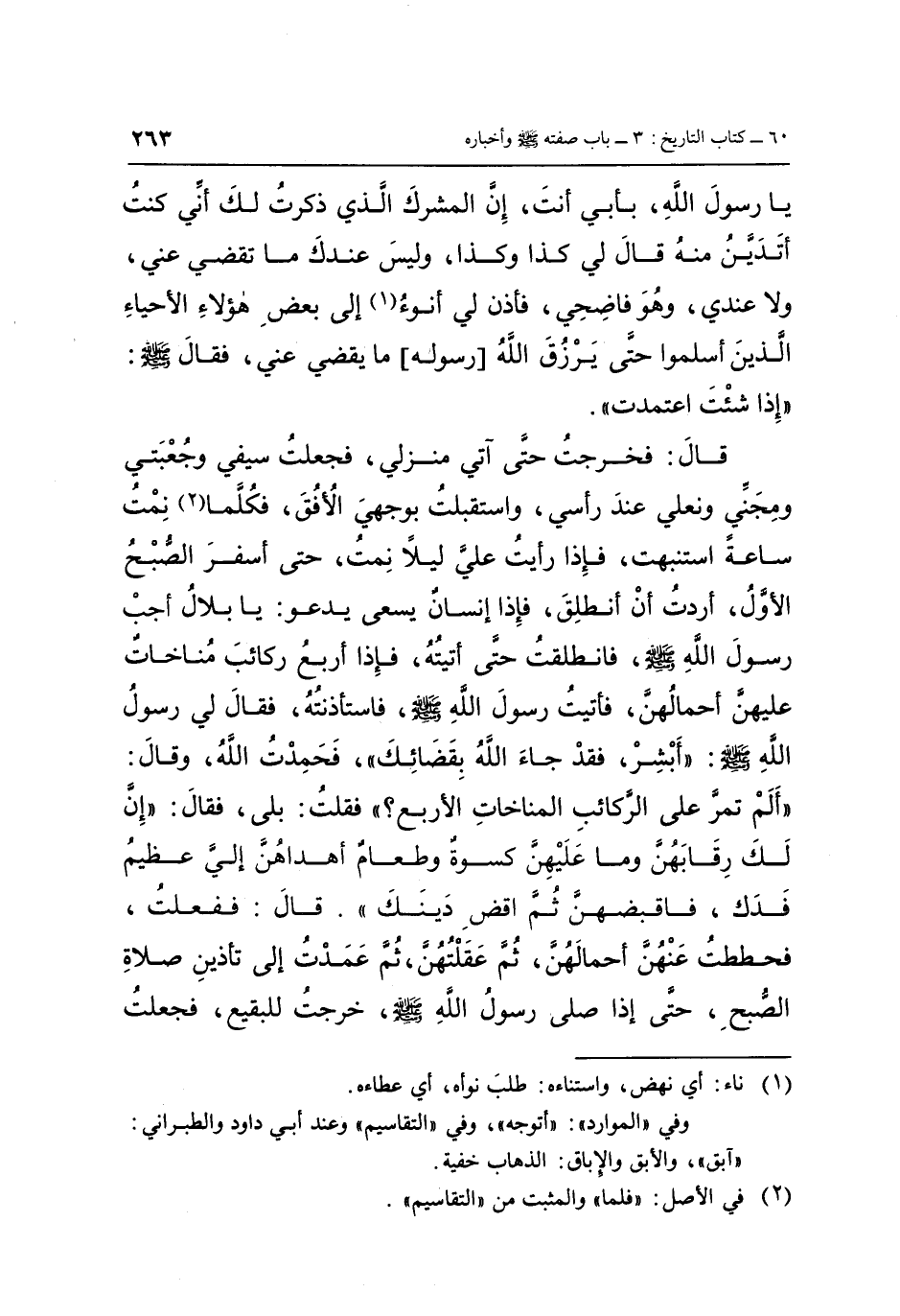 يَا رَسُولَ اللَّهِ بِأَبِي أَنْتَ إِنَّ الْمُشْرِكَ الَّذِي ذَكَرْتُ لَكَ أَنِّي كُنْتُ أَتَدَيَّنُ مِنْهُ قَالَ لِي كَذَا وَكَذَا، وَلَيْسَ عِنْدَكَ مَا تَقْضِي عَنِّي، وَلَا عِنْدِي، وَهُوَ فَاضِحِي، فَأْذَنْ لِي أَنُوءُ (1) إِلَى بَعْضِ هَؤُلَاءِ الْأَحْيَاءِ الَّذِينَ أَسْلَمُوا حَتَّى يَرْزُقَ اللَّهُ رَسُولَهُ مَا يَقْضِي عَنِّي، فَقَالَ صَلَّى اللَّهُ عَلَيْهِ وَسَلَّمَ: «إِذَا شِئْتَ اعْتَمَدْتَ» ، قَالَ: فَخَرَجْتُ حَتَّى آتِيَ مَنْزِلِي، فَجَعَلْتُ سَيْفِي وَجُعْبَتِي وَمِجَنِّي وَنَعْلِي عِنْدَ رَأْسِي، وَاسْتَقْبَلْتُ بِوَجْهِي الْأُفُقَ، فَكُلَّمَا (2) نِمْتُ سَاعَةً اسْتَنْبَهْتُ، فَإِذَا رَأَيْتُ عَلَيَّ لَيْلًا نِمْتُ حَتَّى أَسْفَرَ الصُّبْحُ الْأَوَّلُ، أَرَدْتُ أَنْ أَنْطَلِقَ، فَإِذَا إِنْسَانٌ يَسْعَى يَدْعُو: يَا بِلَالُ أَجِبْ رَسُولَ اللَّهِ صَلَّى اللَّهُ عَلَيْهِ وَسَلَّمَ، فَانْطَلَقْتُ حَتَّى أَتَيْتُهُ، فَإِذَا أَرْبَعُ رَكَائِبَ مُنَاخَاتٌ عَلَيْهِنَّ أَحْمَالُهُنَّ، فَأَتَيْتُ رَسُولَ اللَّهِ صَلَّى اللَّهُ عَلَيْهِ وَسَلَّمَ، فَاسْتَأْذَنْتُهُ، فَقَالَ لِي رَسُولُ اللَّهِ صَلَّى اللَّهُ عَلَيْهِ وَسَلَّمَ: «أَبْشِرْ، فَقَدْ جَاءَ اللَّهُ بِقَضَائِكَ» ، فَحَمِدْتُ اللَّهَ، وَقَالَ: «أَلَمْ تَمَرَّ عَلَى الرَّكَائِبِ الْمُنَاخَاتِ الْأَرْبَعِ؟» ، فَقُلْتُ: بَلَى، فَقَالَ: «إِنَّ لَكَ رِقَابَهُنَّ، وَمَا عَلَيْهِنَّ كِسْوَةٌ وَطَعَامٌ أَهْدَاهُنَّ إِلَيَّ عَظِيمُ فَدَكَ، فَاقْبِضْهُنَّ، ثُمَّ اقْضِ دَيْنَكَ» قَالَ: فَفَعَلْتُ، فَحَطَطْتُ عَنْهُنَّ أَحْمَالَهُنَّ، ثُمَّ عَقَلْتُهُنَّ، ثُمَّ عَمَدْتُ إِلَى تَأْذِينِ صَلَاةِ الصُّبْحِ، حَتَّى إِذَا صَلَّى رَسُولُ اللَّهِ صَلَّى اللَّهُ عَلَيْهِ وَسَلَّمَ خَرَجْتُ لِلْبَقِيعِ، فَجَعَلْتُ
