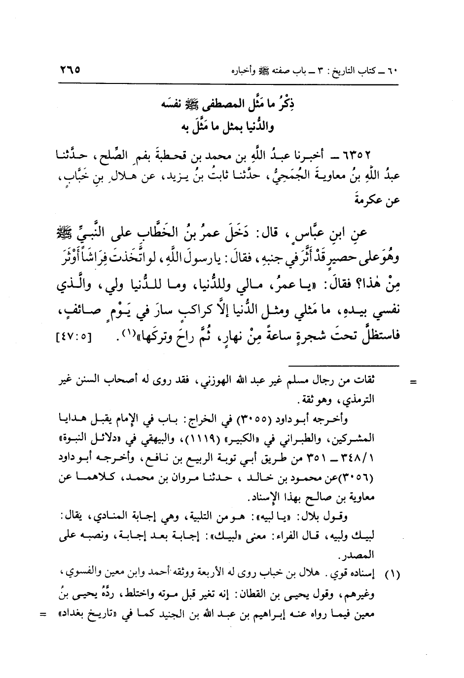 6352 - أَخْبَرَنَا عَبْدُ اللَّهِ بْنُ مُحَمَّدِ بْنِ قَحْطَبَةَ، بِفَمِ الصِّلْحِ، حَدَّثَنَا عَبْدُ اللَّهِ بْنُ مُعَاوِيَةَ الْجُمَحِيُّ، حَدَّثَنَا ثَابِتُ بْنُ يَزِيدَ، عَنْ هِلَالِ بْنِ خَبَّابٍ، عَنْ عِكْرِمَةَ، عَنِ ابْنِ عَبَّاسٍ، قَالَ: دَخَلَ عُمَرُ بْنُ الْخَطَّابِ عَلَى النَّبِيِّ صَلَّى اللَّهُ عَلَيْهِ وَسَلَّمَ وَهُوَ عَلَى حَصِيرٍ قَدْ أَثَرَ فِي جَنْبِهِ، فَقَالَ: يَا رَسُولَ اللَّهِ لَوِ اتَّخَذْتَ فِرَاشًا أَوْثَرَ مِنْ هَذَا؟ فَقَالَ: «يَا عُمَرُ مَا لِي وَلِلدُّنْيَا، وَمَا لِلدُّنْيَا وَلِي، وَالَّذِي نَفْسِي بِيَدِهِ مَا مَثَلِي وَمَثَلُ الدُّنْيَا إِلَّا كَرَاكِبٍ سَارَ فِي يَوْمٍ صَائِفٍ، فَاسْتَظَلَّ تَحْتَ شَجَرَةٍ سَاعَةً مِنْ نَهَارٍ، ثُمَّ رَاحَ وَتَرْكَهَا» (1) 0 [5: 47]