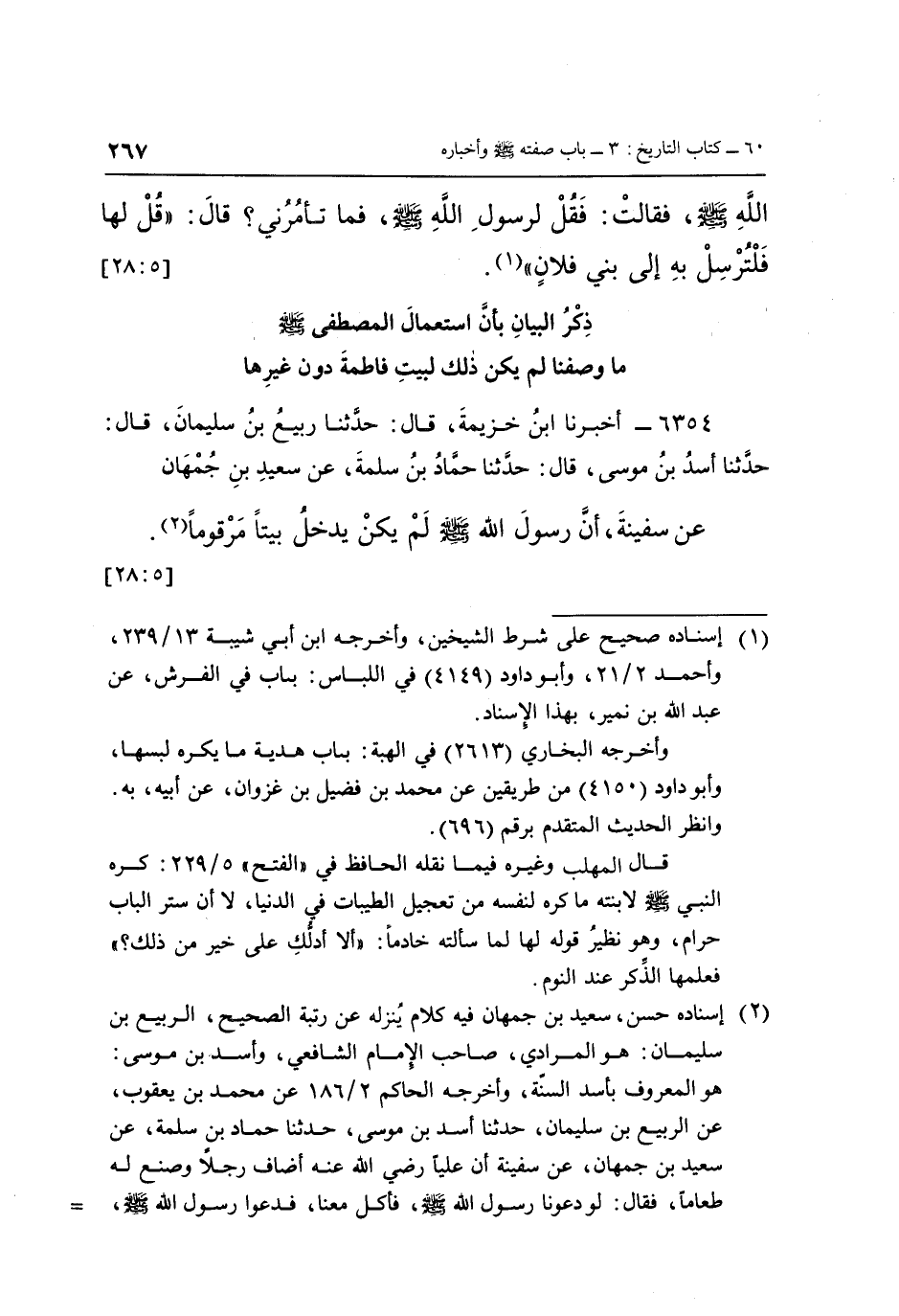 6354 - أَخْبَرَنَا ابْنُ خُزَيْمَةَ، قَالَ: حَدَّثَنَا رَبِيعُ بْنُ سُلَيْمَانَ، قَالَ: حَدَّثَنَا أَسَدُ بْنُ مُوسَى، قَالَ: حَدَّثَنَا حَمَّادُ بْنُ سَلَمَةَ، عَنْ سَعِيدِ بْنِ جُمْهَانَ، عَنْ سَفِينَةَ: «أَنَّ رَسُولَ اللَّهِ صَلَّى اللَّهُ عَلَيْهِ وَسَلَّمَ لَمْ يَكُنْ يَدْخُلُ بَيْتًا مَرْقُومًا» (2) . [5: 28]