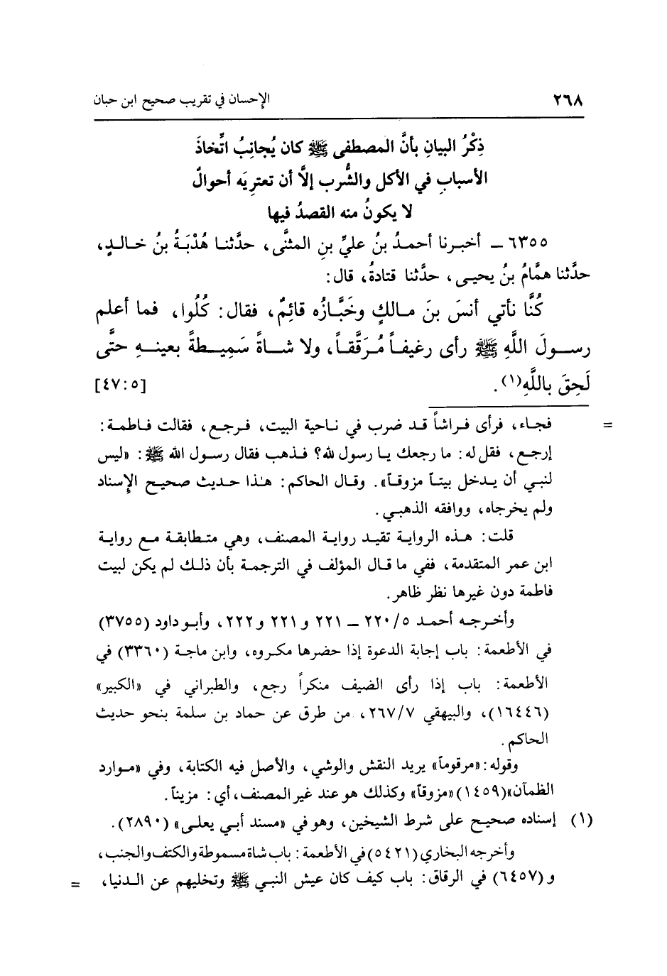 6355 - أَخْبَرَنَا أَحْمَدُ بْنُ عَلِيِّ بْنِ الْمُثَنَّى، حَدَّثَنَا هُدْبَةُ بْنُ خَالِدٍ، حَدَّثَنَا هَمَّامُ بْنُ يَحْيَى، حَدَّثَنَا قَتَادَةُ، قَالَ: كُنَّا نَأْتِي أَنَسَ بْنَ مَالِكٍ وَخَبَّازُهُ قَائِمٌ، فَقَالَ: «كُلُوا، فَمَا أَعْلَمُ رَسُولَ اللَّهِ صَلَّى اللَّهُ عَلَيْهِ وَسَلَّمَ رَأَى رَغِيفًا مُرَقَّقًا، وَلَا شَاةً سَمِيطَةً بِعَيْنِهِ حَتَّى لَحِقَ بِاللَّهِ» (1) . [5: 47]