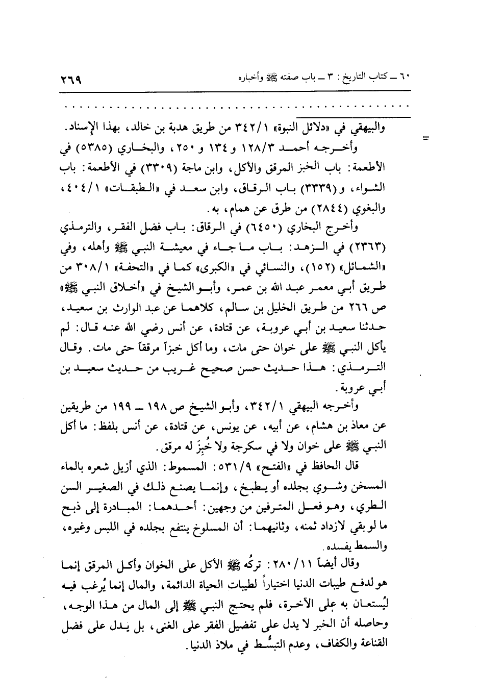 وأخرج البخاري (6450) في الرقاق: باب فضل الفقر، والترمذي (2363) في الزهد: باب ما جاء في معيشة النبي - صلى الله عليه وسلم - وأهله، وفي "الشمائل" (152) ، والنسائي في " الكبرى " كما في "التحفة" 1/308 من طريق أبي معمر عبد الله بن عمر، وأبو الشيخ في " أخلاق النبي - صلى الله عليه وسلم - " ص 266 من طريق الخليل بن سالم، كلاهما عن عبد الوارث بن سعيد، حدثنا سعيد بن أبي عروبة، عن قتادة، عن أنس رضي الله عنه قال: لم يأكل النبي - صلى الله عليه وسلم - على خوان حتى مات، وما أكل خبزاً مرققاً حتى مات. وقال الترمذي: هذا حديث حسن صحيح غريب من حديث سعيد بن أبي عروبة.