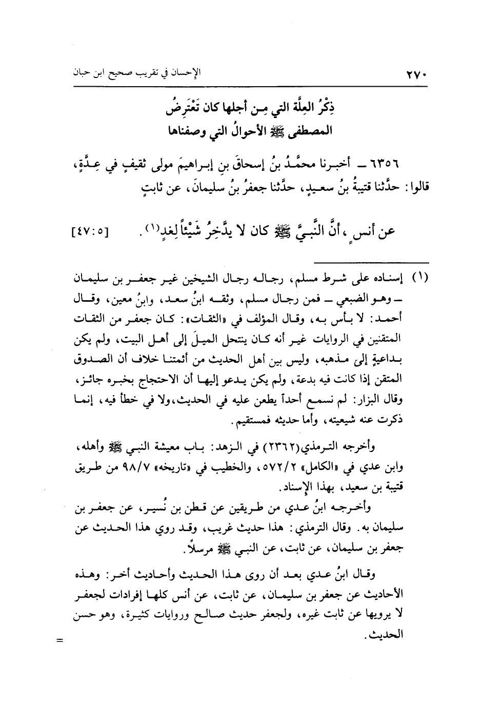 6356 - أَخْبَرَنَا مُحَمَّدُ بْنُ إِسْحَاقَ بْنِ إِبْرَاهِيمَ، مَوْلَى ثَقِيفٍ فِي عِدَّةٍ، قَالُوا: حَدَّثَنَا قُتَيْبَةُ بْنُ سَعِيدٍ، حَدَّثَنَا جَعْفَرُ بْنُ سُلَيْمَانَ، عَنْ ثَابِتٍ، عَنْ أَنَسٍ: «أَنَّ النَّبِيَّ صَلَّى اللَّهُ عَلَيْهِ وَسَلَّمَ كَانَ لَا يَدَّخِرُ شَيْئًا لِغَدٍ» (1) 0 [5: 47]