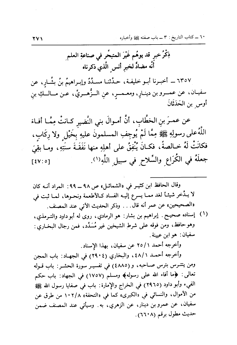 6357 - أَخْبَرَنَا أَبُو خَلِيفَةَ، حَدَّثَنَا مُسَدَّدٌ، وَإِبْرَاهِيمُ بْنُ بَشَّارٍ، عَنْ سُفْيَانَ، عَنْ عَمْرِو بْنِ دِينَارٍ، وَمَعْمَرٍ، عَنِ الزُّهْرِيِّ، عَنْ مَالِكِ بْنِ أَوْسِ بْنِ الْحَدَثَانِ، عَنْ عُمَرَ بْنِ الْخَطَّابِ: «أَنَّ أَمْوَالَ بَنِي النَّضِيرِ كَانَتْ مِمَّا أَفَاءَ اللَّهُ عَلَى رَسُولِهِ صَلَّى اللَّهُ عَلَيْهِ وَسَلَّمَ مِمَّا لَمْ يُوجِفِ الْمُسْلِمُونَ عَلَيْهِ بِخَيْلٍ وَلَا رِكَابٍ، فَكَانَتْ لَهُ خَالِصَةٌ، فَكَانَ يُنْفِقُ عَلَى أَهْلِهِ مِنْهَا نَفَقَةَ سَنَتِهِ، وَمَا بَقِيَ جَعَلَهُ فِي الْكُرَاعِ وَالسِّلَاحِ فِي سَبِيلِ اللَّهِ» (1) . [5: 47]