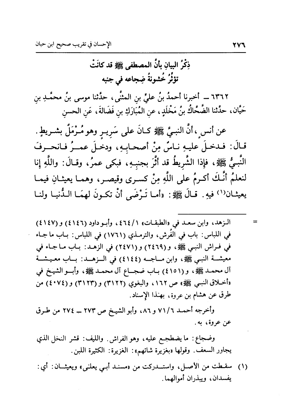 ذِكْرُ الْبَيَانِ بِأَنَّ الْمُصْطَفَى صَلَّى اللَّهُ عَلَيْهِ وَسَلَّمَ قَدْ كَانَتْ تُؤَثِّرُ خُشُونَةُ ضِجَاعِهِ فِي جَنْبِهِ