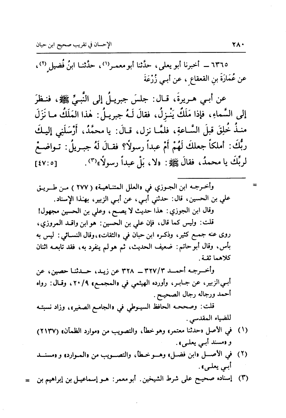6365 - أَخْبَرَنَا أَبُو يَعْلَى، حَدَّثَنَا أَبُو مَعْمَرٍ (1) ، حَدَّثَنَا ابْنُ فُضَيْلٍ (2) ، عَنْ عُمَارَةَ بْنِ الْقَعْقَاعِ، عَنْ أَبِي زُرْعَةَ، عَنْ أَبِي هُرَيْرَةَ، قَالَ: جَلَسَ جِبْرِيلُ إِلَى النَّبِيِّ صَلَّى اللَّهُ عَلَيْهِ وَسَلَّمَ، فَنَظَرَ إِلَى السَّمَاءِ، فَإِذَا مَلَكٌ يَنْزِلُ، فَقَالَ لَهُ جِبْرِيلُ: هَذَا الْمَلَكُ مَا نَزَلَ مُنْذُ خُلِقَ قَبْلَ السَّاعَةِ، فَلَمَّا نَزَلَ قَالَ: يَا مُحَمَّدُ أَرْسَلَنِي إِلَيْكَ رَبُّكَ أَمَلَكًا جَعَلَكَ لَهُمْ أَمْ عَبْدًا رَسُولًا؟ فَقَالَ لَهُ جِبْرِيلُ: تَوَاضَعْ لِرَبِّكَ يَا مُحَمَّدُ، فَقَالَ صَلَّى اللَّهُ عَلَيْهِ وَسَلَّمَ: «لَا بَلْ عَبْدًا رَسُولًا» (3) . [5: 47]