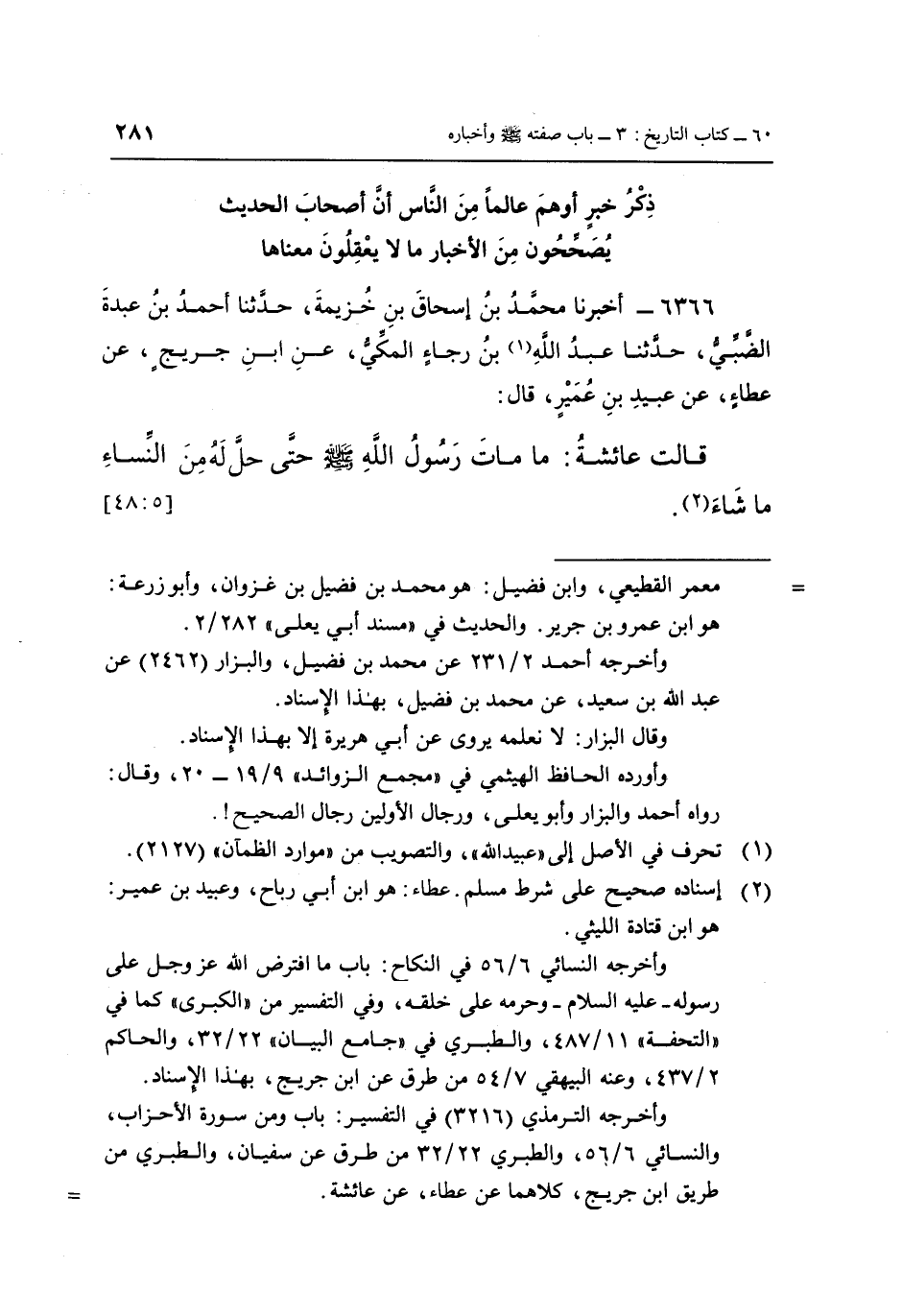 6366 - أَخْبَرَنَا مُحَمَّدُ بْنُ إِسْحَاقَ بْنِ خُزَيْمَةَ، حَدَّثَنَا أَحْمَدُ بْنُ عَبْدَةَ الضَّبِّيُّ، حَدَّثَنَا عَبْدُ اللَّهِ (1) بْنُ رَجَاءٍ الْمَكِّيُّ، عَنِ ابْنِ جُرَيْجٍ، عَنْ عَطَاءٍ، عَنْ عُبَيْدِ بْنِ عُمَيْرٍ، قَالَ: قَالَتْ عَائِشَةُ: «مَا مَاتَ رَسُولُ اللَّهِ صَلَّى اللَّهُ عَلَيْهِ وَسَلَّمَ حَتَّى حَلَّ لَهُ مِنَ النِّسَاءِ مَا شَاءَ» (2) . [5: 48]