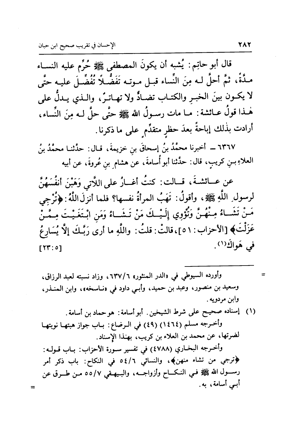 قَالَ أَبُو حَاتِمٍ: «يُشْبِهُ أَنْ يَكُونَ الْمُصْطَفَى صَلَّى اللَّهُ عَلَيْهِ وَسَلَّمَ حُرِّمَ عَلَيْهِ النِّسَاءُ مُدَّةً، ثُمَّ أُحِلَّ لَهُ مِنَ النِّسَاءِ قَبْلَ مَوْتِهِ تَفَضُّلًا تُفُضِّلَ عَلَيْهِ حَتَّى لَا يَكُونَ بَيْنَ الْخَبَرِ وَالْكِتَابِ تَضَادُّ، وَلَا تَهَاتِرُ، وَالَّذِي يَدُلُّ عَلَى هَذَا قَوْلُ عَائِشَةَ: مَا مَاتَ رَسُولُ اللَّهِ صَلَّى اللَّهُ عَلَيْهِ وَسَلَّمَ حَتَّى حَلَّ لَهُ مِنَ النِّسَاءِ.