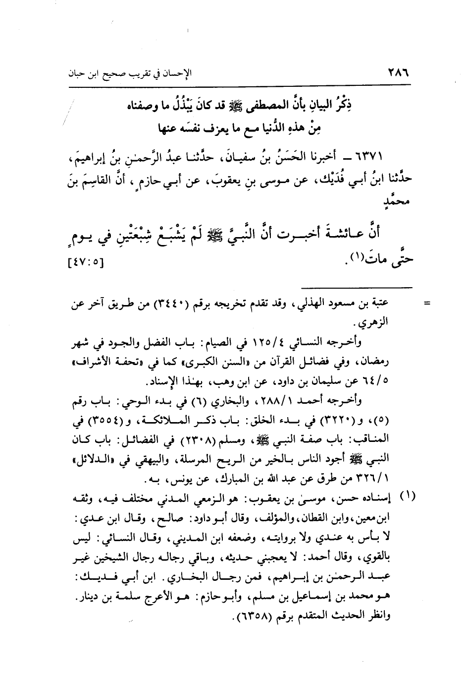 6371 - أَخْبَرَنَا الْحَسَنُ بْنُ سُفْيَانَ، حَدَّثَنَا عَبْدُ الرَّحْمَنِ بْنُ إِبْرَاهِيمَ، حَدَّثَنَا ابْنُ أَبِي فُدَيْكٍ، عَنْ مُوسَى بْنِ يَعْقُوبَ، عَنْ أَبِي حَازِمٍ، أَنَّ الْقَاسِمَ بْنَ مُحَمَّدٍ، أَنَّ عَائِشَةَ، أَخْبَرَتْ: «أَنَّ النَّبِيَّ صَلَّى اللَّهُ عَلَيْهِ وَسَلَّمَ لَمْ يَشْبَعْ شَبْعَتَيْنِ فِي يَوْمٍ حَتَّى مَاتَ» (1) . [5: 47]