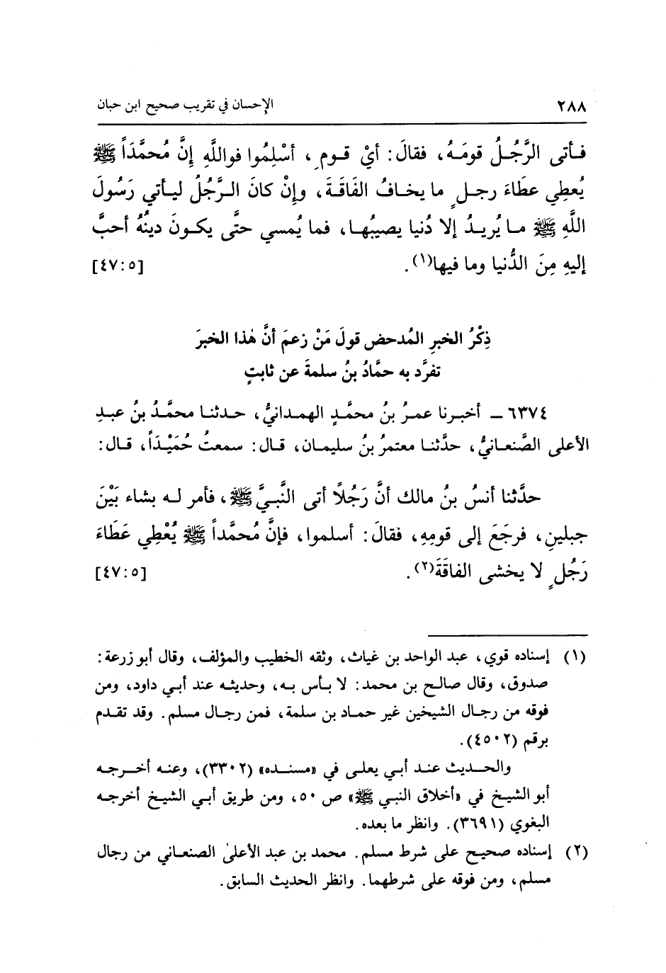 6374 - أَخْبَرَنَا عُمَرُ بْنُ مُحَمَّدٍ الْهَمْدَانِيُّ، حَدَّثَنَا مُحَمَّدُ بْنُ عَبْدِ الْأَعْلَى الصَّنْعَانِيُّ، حَدَّثَنَا مُعْتَمِرُ بْنُ سُلَيْمَانَ، قَالَ: سَمِعْتُ حُمَيْدًا، قَالَ: حَدَّثَنَا أَنَسُ بْنُ مَالِكٍ: أَنَّ رَجُلًا أَتَى النَّبِيَّ صَلَّى اللَّهُ عَلَيْهِ وَسَلَّمَ، فَأَمَرَ لَهُ بِشَاءٍ بَيْنَ جَبَلَيْنِ، فَرَجَعَ إِلَى قَوْمِهِ، فَقَالَ: «أَسْلِمُوا، فَإِنَّ مُحَمَّدًا صَلَّى اللَّهُ عَلَيْهِ وَسَلَّمَ يُعْطِي عَطَاءَ رَجُلٍ لَا يَخْشَى الْفَاقَةَ» (2) . [5: 47]