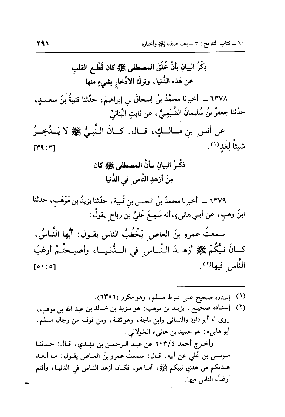 6378 - أَخْبَرَنَا مُحَمَّدُ بْنُ إِسْحَاقَ بْنِ إِبْرَاهِيمَ، حَدَّثَنَا قُتَيْبَةُ بْنُ سَعِيدٍ، حَدَّثَنَا جَعْفَرُ بْنُ سُلَيْمَانَ الضُّبَعِيُّ، عَنْ ثَابِتٍ الْبُنَانِيِّ، عَنْ أَنَسِ بْنِ مَالِكٍ، قَالَ: «كَانَ النَّبِيُّ صَلَّى اللَّهُ عَلَيْهِ وَسَلَّمَ لَا يَدَّخِرُ شَيْئًا لِغَدٍ» (1) . [3: 39]