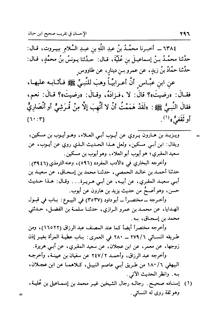 6384 - أَخْبَرَنَا مُحَمَّدُ بْنُ عَبْدِ اللَّهِ بْنِ عَبْدِ السَّلَامِ، بِبَيْرُوتَ، قَالَ: حَدَّثَنَا مُحَمَّدُ بْنُ إِسْمَاعِيلَ بْنِ عُلَيَّةَ، قَالَ: حَدَّثَنَا يُونُسُ بْنُ مُحَمَّدٍ، قَالَ: حَدَّثَنَا حَمَّادُ بْنُ زَيْدٍ، عَنْ عَمْرِو بْنِ دِينَارٍ، عَنْ طَاوُسٍ، عَنِ ابْنِ عَبَّاسٍ: أَنَّ أَعْرَابِيًّا وَهَبَ لِلنَّبِيِّ صَلَّى اللَّهُ عَلَيْهِ وَسَلَّمَ، فَأَثَابَهُ عَلَيْهَا، فَقَالَ: «رَضِيتَ؟» ، قَالَ: لَا، فَزَادَهُ، وَقَالَ: «رَضِيتَ؟» ، قَالَ: نَعَمْ، فَقَالَ النَّبِيُّ صَلَّى اللَّهُ عَلَيْهِ وَسَلَّمَ: «لَقَدْ هَمَمْتُ أَنْ لَا أَتَّهِبُ إِلَّا مِنْ قُرَشِيٍّ أَوْ أَنْصَارِيٍّ أَوْ ثَقَفِيٍّ» (1) . [3: 60]