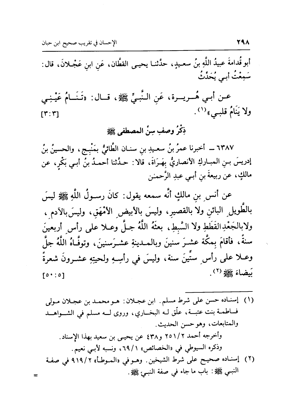 أَبُو قُدَامَةَ عُبَيْدُ اللَّهِ بْنُ سَعِيدٍ، حَدَّثَنَا يَحْيَى الْقَطَّانُ، عَنِ ابْنِ عَجْلَانَ، قَالَ: سَمِعْتُ أَبِيَ، يُحَدِّثُ، عَنْ أَبِي هُرَيْرَةَ، عَنِ النَّبِيِّ صَلَّى اللَّهُ عَلَيْهِ وَسَلَّمَ قَالَ: «تَنَامُ عَيْنِي وَلَا يَنَامُ قَلْبِي» (1) . [3: 3]
