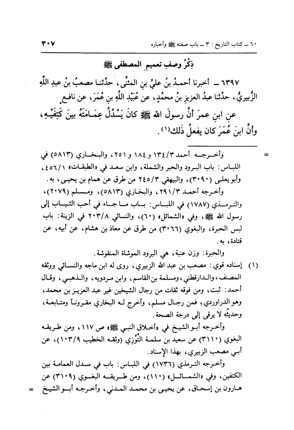 6397 - أَخْبَرَنَا أَحْمَدُ بْنُ عَلِيِّ بْنِ الْمُثَنَّى، حَدَّثَنَا مُصْعَبُ بْنُ عَبْدِ اللَّهِ الزُّبَيْرِيُّ، حَدَّثَنَا عَبْدُ الْعَزِيزِ بْنُ مُحَمَّدٍ، عَنْ عُبَيْدِ اللَّهِ بْنِ عُمَرَ، عَنْ نَافِعٍ، عَنِ ابْنِ عُمَرَ: «أَنَّ رَسُولَ اللَّهِ صَلَّى اللَّهُ عَلَيْهِ وَسَلَّمَ كَانَ يَسْدُلُ عِمَامَتَهُ بَيْنَ كَتِفَيْهِ» ، وَأَنَّ ابْنَ عُمَرَ كَانَ يَفْعَلُ ذَلِكَ. (1) .