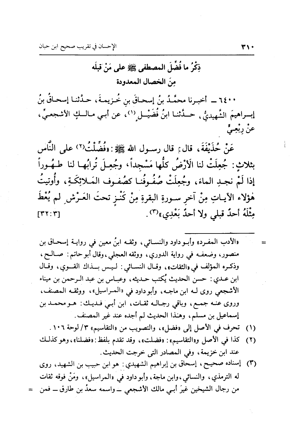 6400 - أَخْبَرَنَا مُحَمَّدُ بْنُ إِسْحَاقَ بْنِ خُزَيْمَةَ، حَدَّثَنَا إِسْحَاقُ بْنُ إِبْرَاهِيمَ الشَّهِيدِيُّ، حَدَّثَنَا ابْنُ فُضَيْلٍ (1) ، عَنْ أَبِي مَالِكٍ الْأَشْجَعِيِّ، عَنْ رِبْعِيٍّ، عَنْ حُذَيْفَةَ، قَالَ: قَالَ رَسُولُ اللَّهِ صَلَّى اللَّهُ عَلَيْهِ وَسَلَّمَ: «فُضِّلْتُ (2) عَلَى النَّاسِ بِثَلَاثٍ: جُعِلَتْ لَنَا الْأَرْضُ كُلُّهَا مَسْجِدًا، وَجُعِلَ تُرَابُهَا لَنَا طَهُورًا إِذَا لَمْ نَجِدِ الْمَاءَ، وَجُعِلَتْ صُفُوفُنَا كَصُفُوفِ الْمَلَائِكَةِ، وَأُوتِيتُ هَؤُلَاءِ الْآيَاتِ مِنْ آخِرِ سُورَةِ الْبَقَرَةِ مِنْ كَنْزٍ تَحْتَ الْعَرْشِ لَمْ يُعْطَ مِثْلَهُ أَحَدٌ قَبْلِي وَلَا أَحَدٌ بَعْدِي» (3) . [3: 32]