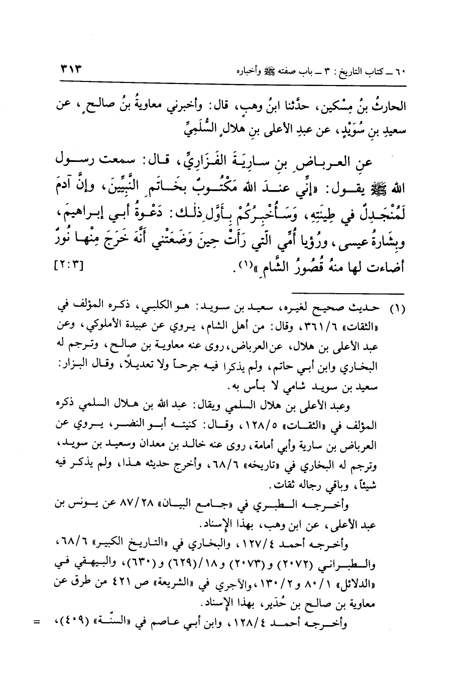 الْحَارِثُ بْنُ مِسْكِينٍ، حَدَّثَنَا ابْنُ وَهْبٍ، قَالَ: وَأَخْبَرَنِي مُعَاوِيَةُ بْنُ صَالِحٍ، عَنْ سَعِيدِ بْنِ سُوَيْدٍ، عَنْ عَبْدِ الْأَعْلَى بْنِ هِلَالٍ السُّلَمِيِّ، عَنِ الْعِرْبَاضِ بْنِ سَارِيَةَ الْفَزَارِيِّ، قَالَ: سَمِعْتُ رَسُولَ اللَّهِ صَلَّى اللَّهُ عَلَيْهِ وَسَلَّمَ يَقُولُ: «إِنِّي عِنْدَ اللَّهِ مَكْتُوبٌ بِخَاتَمِ النَّبِيِّينَ، وَإِنَّ آدَمَ لَمُنْجَدِلٌ فِي طِينَتِهِ، وَسَأُخْبِرُكُمْ بِأَوَّلِ ذَلِكَ: دَعْوَةُ أَبِي إِبْرَاهِيمَ، وَبِشَارَةُ عِيسَى، وَرُؤْيَا أُمِّيَ الَّتِي رَأَتْ حِينَ وَضَعَتْنِي أَنَّهُ خَرَجَ مِنْهَا نُورٌ أَضَاءَتْ لَهَا مِنْهُ قُصُورُ الشَّامِ» (1) . [3: 2]