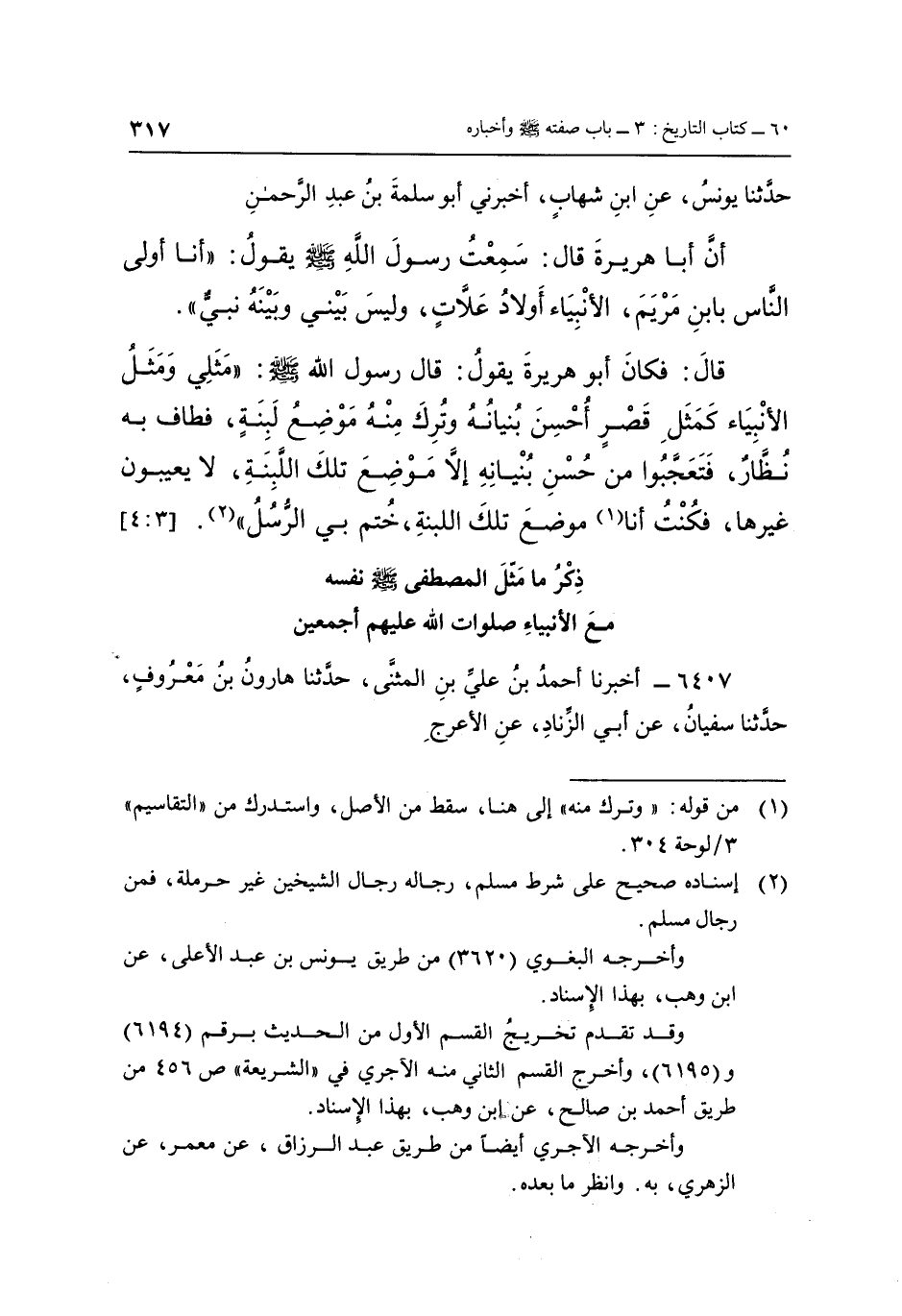 قَالَ: فَكَانَ أَبُو هُرَيْرَةَ يَقُولُ: قَالَ رَسُولُ اللَّهِ صَلَّى اللَّهُ عَلَيْهِ وَسَلَّمَ: «مَثَلِي وَمَثَلُ الْأَنْبِيَاءِ كَمَثَلِ قَصْرٍ أُحْسِنَ بُنْيَانُهُ، وَتُرِكَ مِنْهُ مَوْضِعُ لَبِنَةٍ فَطَافَ بِهِ نُظَّارٌ، فَتَعَجَّبُوا مِنْ حُسْنِ بُنْيَانِهِ إِلَّا مَوْضِعَ تِلْكَ اللَّبِنَةِ، لَا يَعِيبُونَ غَيْرَهَا، فَكُنْتُ أَنَا (1) مَوْضِعَ تِلْكَ اللَّبِنَةِ، خُتِمَ بِيَ الرُّسُلُ» (2) . [3: 4]