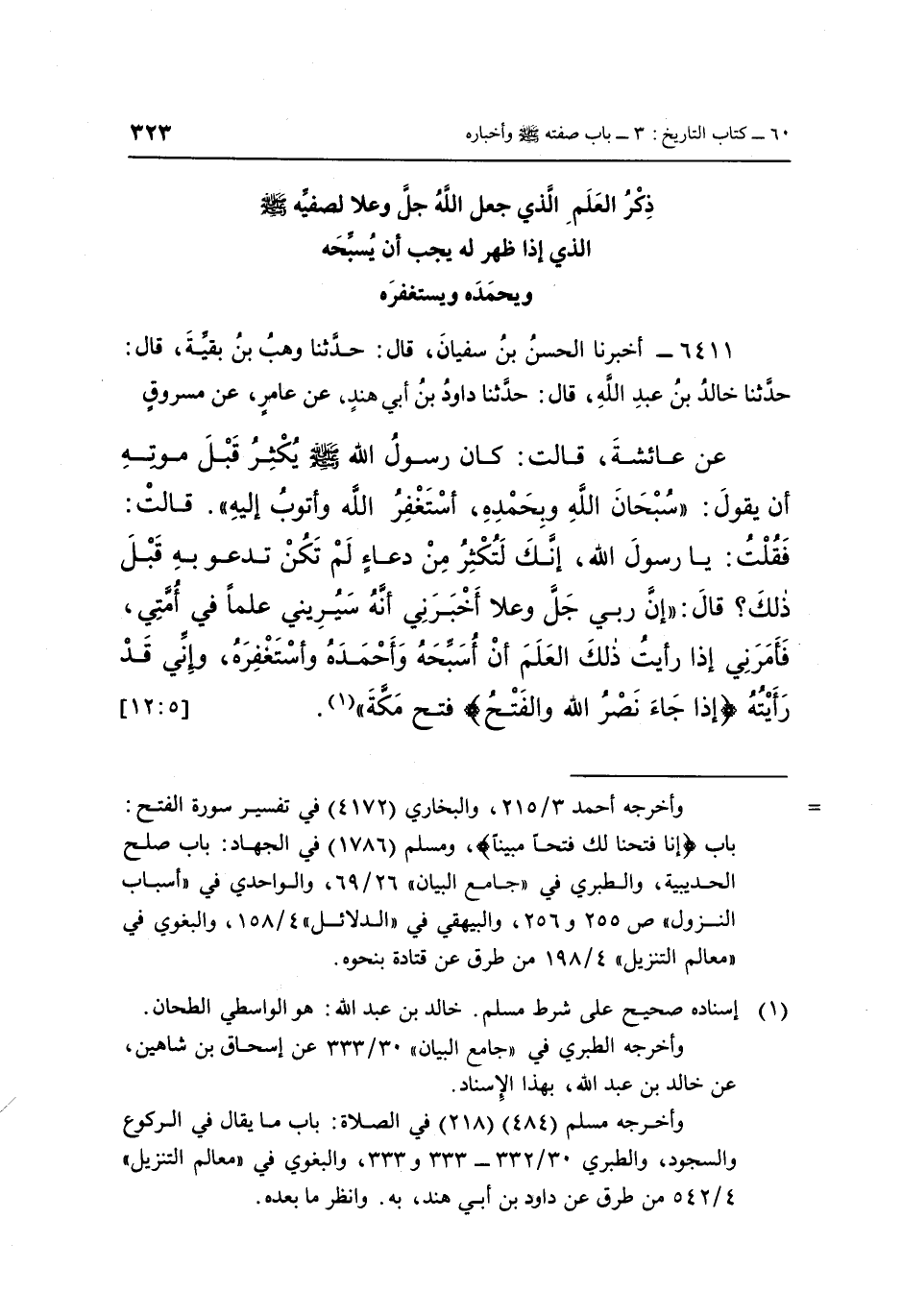 6411 - أَخْبَرَنَا الْحَسَنُ بْنُ سُفْيَانَ، قَالَ: حَدَّثَنَا وَهْبُ بْنُ بَقِيَّةَ، قَالَ: حَدَّثَنَا خَالِدُ بْنُ عَبْدِ اللَّهِ، قَالَ: حَدَّثَنَا دَاوُدُ بْنُ أَبِي هِنْدَ، عَنْ عَامِرٍ، عَنْ مَسْرُوقٍ، عَنْ عَائِشَةَ، قَالَتْ: كَانَ رَسُولُ اللَّهِ صَلَّى اللَّهُ عَلَيْهِ وَسَلَّمَ يُكْثِرُ قَبْلَ مَوْتِهِ أَنْ يَقُولَ: «سُبْحَانَ اللَّهِ وَبِحَمْدِهِ، أَسْتَغْفِرُ اللَّهَ، وَأَتُوبُ إِلَيْهِ» قَالَتْ: فَقُلْتُ: يَا رَسُولَ اللَّهِ، إِنَّكَ لِتُكْثِرَ مِنْ دُعَاءٍ، لَمْ تَكُنْ تَدْعُو بِهِ قَبْلَ ذَلِكَ؟ قَالَ: «إِنَّ رَبِّي جَلَّ وَعَلَا أَخْبَرَنِي أَنَّهُ سَيُرِينِي عِلْمًا فِي أُمَّتِي، فَأَمَرَنِي إِذَا رَأَيْتُ ذَلِكَ الْعِلْمَ أَنْ أُسَبِّحَهُ، وَأَحْمَدَهُ، وَأَسْتَغْفِرَهُ، وَإِنِّي قَدْ رَأَيْتُهُ {إِذَا جَاءَ نَصْرُ اللَّهِ وَالْفَتْحُ} ، فَتْحُ مَكَّةَ» (1) . [5: 12]
