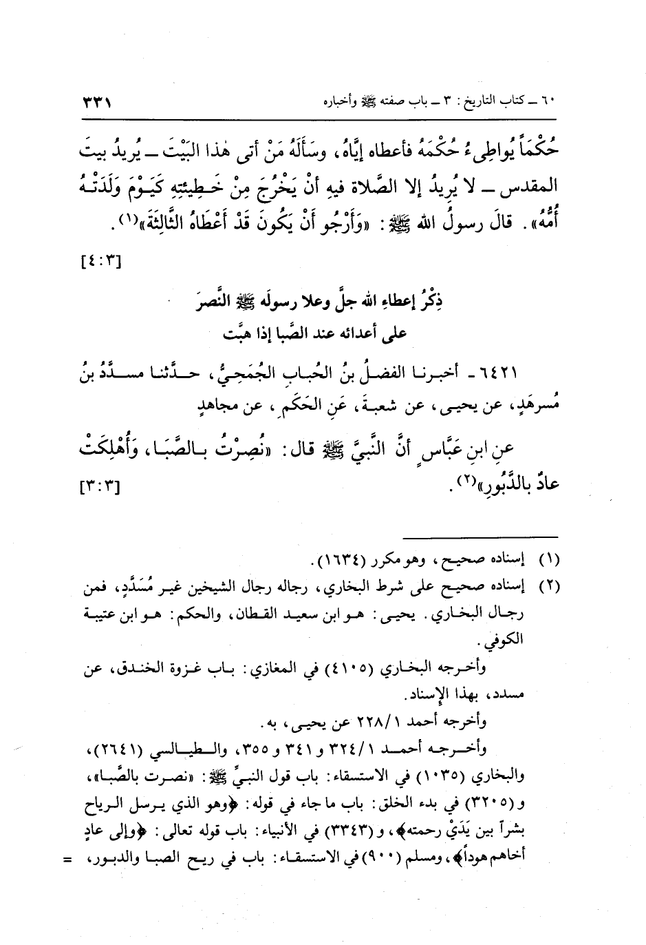 6421 - أَخْبَرَنَا الْفَضْلُ بْنُ الْحُبَابِ الْجُمَحِيُّ، حَدَّثَنَا مُسَدَّدُ بْنُ مُسَرْهَدٍ، عَنْ يَحْيَى، عَنْ شُعْبَةَ، عَنِ الْحَكَمِ، عَنْ مُجَاهِدٍ، عَنِ ابْنِ عَبَّاسٍ، أَنَّ النَّبِيَّ صَلَّى اللَّهُ عَلَيْهِ وَسَلَّمَ، قَالَ: «نُصِرْتُ بِالصَّبَا، وَأُهْلِكَتْ عَادُ بِالدَّبُورِ» (2) . [3: 3]