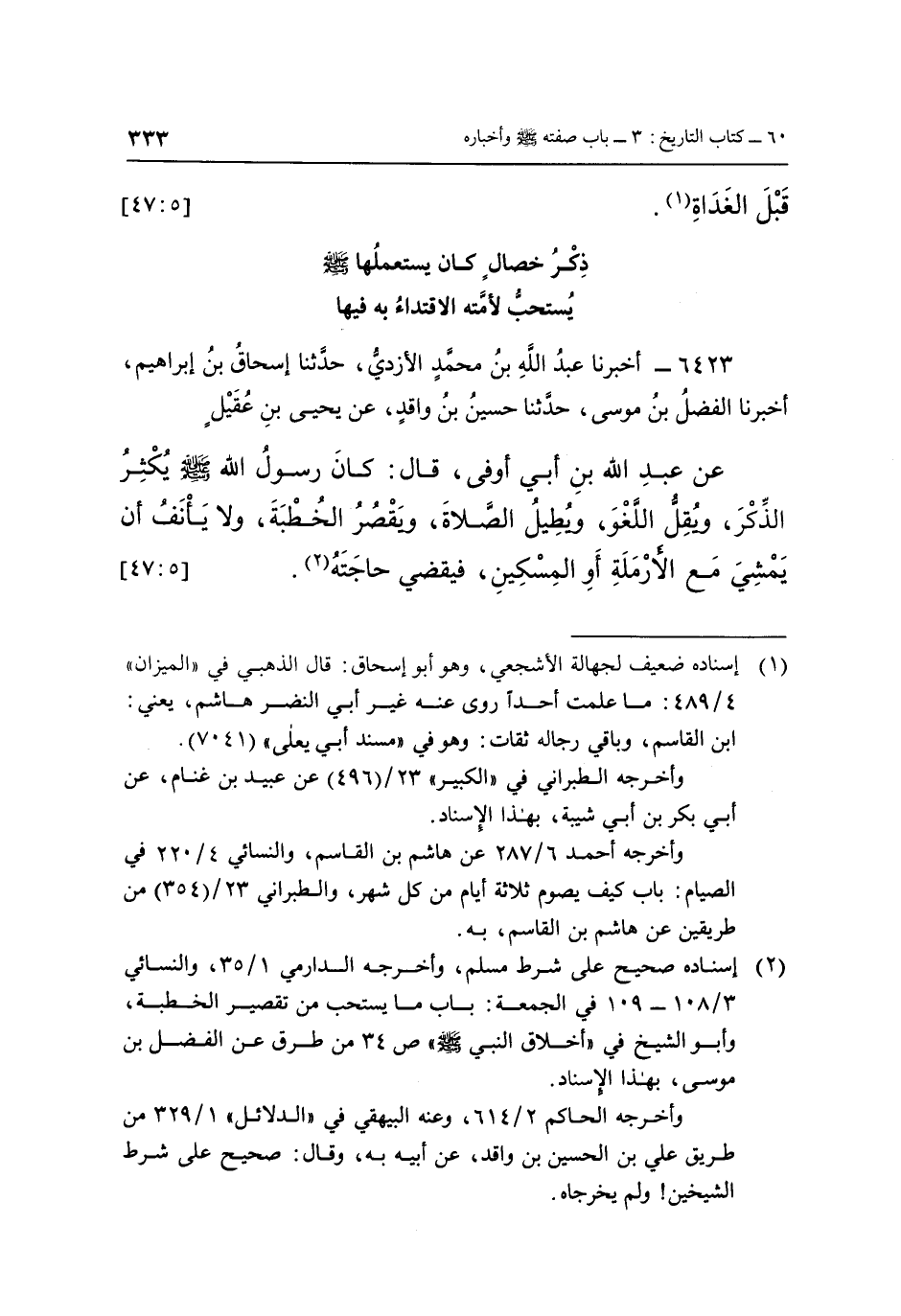 6423 - أَخْبَرَنَا عَبْدُ اللَّهِ بْنُ مُحَمَّدٍ الْأَزْدِيُّ، حَدَّثَنَا إِسْحَاقُ بْنُ إِبْرَاهِيمَ، أَخْبَرَنَا الْفَضْلُ بْنُ مُوسَى، حَدَّثَنَا حُسَيْنُ بْنُ وَاقِدٍ، عَنْ يَحْيَى بْنِ عَقِيلٍ، عَنْ عَبْدِ اللَّهِ بْنِ أَبِي أَوْفَى، قَالَ: «كَانَ رَسُولُ اللَّهِ صَلَّى اللَّهُ عَلَيْهِ وَسَلَّمَ يُكْثِرُ الذِّكْرَ، وَيُقِلُّ اللَّغْوَ، وَيُطِيلُ الصَّلَاةَ، وَيُقَصِّرُ الْخُطْبَةَ، وَلَا يَأْنَفُ أَنْ يَمْشِيَ مَعَ الْأَرْمَلَةِ أَوِ الْمِسْكِينِ، فَيَقْضِيَ حَاجَتَهُ» (2) 0 [5: 47]