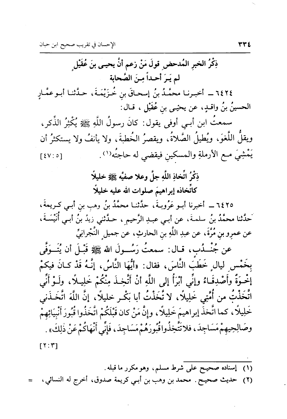 6425 - أَخْبَرَنَا أَبُو عَرُوبَةَ، حَدَّثَنَا مُحَمَّدُ بْنُ وَهْبِ بْنِ أَبِي كَرِيمَةَ، حَدَّثَنَا مُحَمَّدُ بْنُ سَلَمَةَ، عَنْ أَبِي عَبْدِ الرَّحِيمِ، حَدَّثَنِي زَيْدُ بْنُ أَبِي أُنَيْسَةَ، عَنْ عَمْرِو بْنِ مُرَّةَ، عَنْ عَبْدِ اللَّهِ بْنِ الْحَارِثِ، عَنْ جَمِيلٍ النَّجْرَانِيِّ، عَنْ جُنْدُبٍ، قَالَ: سَمِعْتُ رَسُولَ اللَّهِ صَلَّى اللَّهُ عَلَيْهِ وَسَلَّمَ قَبْلَ أَنْ يُتَوَفَّى بِخَمْسِ لَيَالٍ خَطَبَ النَّاسَ، فَقَالَ: «أَيُّهَا النَّاسُ إِنَّهُ قَدْ كَانَ فِيكُمْ إِخْوَةٌ وَأَصْدِقَاءُ، وَإِنِّي أَبْرَأُ إِلَى اللَّهِ أَنْ أَتَّخِذَ مِنْكُمْ خَلِيلًا، وَلَوْ أَنِّي اتَّخَذْتُ مِنْ أُمَّتِي خَلِيلًا لَاتَّخَذْتُ أَبَا بَكْرٍ خَلِيلًا، إِنَّ اللَّهَ اتَّخَذَنِي خَلِيلًا كَمَا اتَّخَذَ إِبْرَاهِيمَ خَلِيلًا، وَإِنَّ مَنْ كَانَ قَبْلَكُمُ اتَّخَذُوا قُبُورَ أَنْبِيَائِهِمْ وَصَالِحِيهِمْ مَسَاجِدَ، فَلَا تَتَّخِذُوا قُبُورَهُمْ مَسَاجِدَ، فَإِنِّي أَنْهَاكُمْ عَنْ ذَلِكَ» . [3: 2]