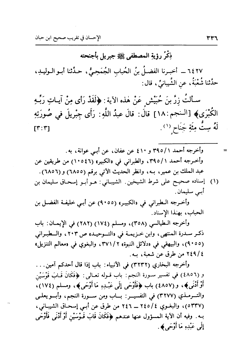 6427 - أَخْبَرَنَا الْفَضْلُ بْنُ الْحُبَابِ الْجُمَحِيُّ، حَدَّثَنَا أَبُو الْوَلِيدِ، حَدَّثَنَا شُعْبَةُ، عَنِ الشَّيْبَانِيِّ، قَالَ: سَأَلْتُ زِرَّ بْنَ حُبَيْشٍ عَنْ هَذِهِ الْآيَةِ: {لَقَدْ رَأَى مِنْ آيَاتِ رَبِّهِ الْكُبْرَى} [النجم: 18] ، قَالَ: قَالَ عَبْدُ اللَّهِ: «رَأَى جِبْرِيلَ فِي صُورَتِهِ لَهُ سِتُّ مِائَةِ جَنَاحٍ» (1) . [3: 3]