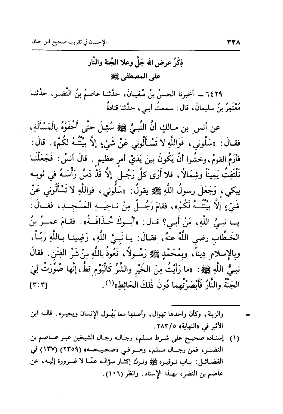 6429 - أَخْبَرَنَا الْحَسَنُ بْنُ سُفْيَانَ، حَدَّثَنَا عَاصِمُ بْنُ النَّضْرِ، حَدَّثَنَا مُعْتَمِرُ بْنُ سُلَيْمَانَ، قَالَ: سَمِعْتُ أَبِيَ، حَدَّثَنَا قَتَادَةُ، عَنْ أَنَسِ بْنِ مَالِكٍ، أَنَّ النَّبِيَّ صَلَّى اللَّهُ عَلَيْهِ وَسَلَّمَ سُئِلَ حَتَّى أَحْفَوْهُ بِالْمَسْأَلَةِ، فَقَالَ: «سَلُونِي، فَوَاللَّهِ لَا تَسْأَلُونِي عَنْ شَيْءٍ إِلَّا بَيَّنْتُهُ لَكُمْ» قَالَ: فَأَرَمَّ الْقَوْمُ، وَخَشُوا أَنْ يَكُونَ بَيْنَ يَدَيْ أَمْرٍ عَظِيمٍ، قَالَ أَنَسٌ: فَجَعَلْنَا نَلْتَفِتُ يَمِينًا وَشِمَالًا، فَلَا أَرَى كُلَّ رَجُلٍ إِلَّا قَدْ دَسَّ رَأْسَهُ فِي ثَوْبِهِ يَبْكِي، وَجَعَلَ رَسُولُ اللَّهِ صَلَّى اللَّهُ عَلَيْهِ وَسَلَّمَ يَقُولُ: «سَلُونِي، فَوَاللَّهِ لَا تَسْأَلُونِي عَنْ شَيْءٍ إِلَّا بَيَّنْتُهُ لَكُمْ» ، فَقَامَ رَجُلٌ مِنْ نَاحِيَةِ الْمَسْجِدِ، فَقَالَ: يَا نَبِيَّ اللَّهِ مَنْ أَبِي؟ قَالَ: «أَبُوكَ حُذَافَةُ» ، فَقَامَ عُمَرُ بْنُ الْخَطَّابِ رَضِيَ اللَّهُ عَنْهُ، فَقَالَ: يَا نَبِيَّ اللَّهِ رَضِينَا بِاللَّهِ رَبًّا، وَبِالْإِسْلَامِ دَيْنًا، وَبِمُحَمَّدٍ صَلَّى اللَّهُ عَلَيْهِ وَسَلَّمَ رَسُولًا، نَعُوذُ بِاللَّهِ مِنْ شَرِّ الْفِتَنِ، فَقَالَ نَبِيُّ اللَّهِ صَلَّى اللَّهُ عَلَيْهِ وَسَلَّمَ: «مَا رَأَيْتُ مِنَ الْخَيْرِ وَالشَّرِّ كَالْيَوْمِ قَطُّ، إِنَّهَا صُوِّرَتْ لِيَ الْجَنَّةُ وَالنَّارُ، فَأَبْصَرْتُهُمَا دُونَ ذَلِكَ الْحَائِطِ» (1) . [3: 3]