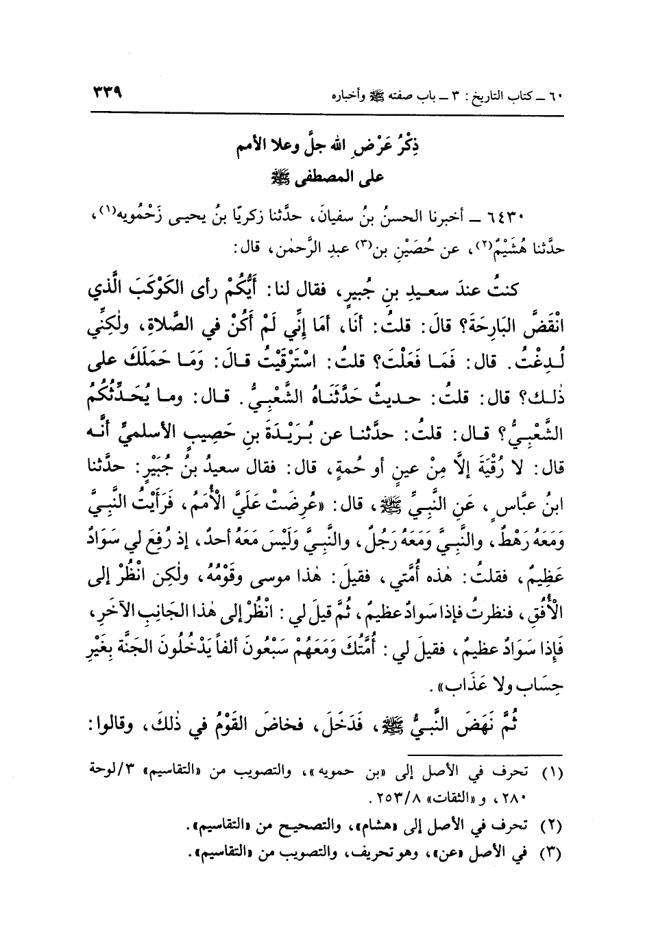 قَالَ: فَقَالَ سَعِيدُ بْنُ جُبَيْرٍ، حَدَّثَنَا ابْنُ عَبَّاسٍ، عَنِ النَّبِيِّ صَلَّى اللَّهُ عَلَيْهِ وَسَلَّمَ قَالَ: «عُرِضَتْ عَلَيَّ الْأُمَمُ، فَرَأَيْتُ النَّبِيَّ وَمَعَهُ رَهْطٌ، وَالنَّبِيَّ وَمَعَهُ رَجُلٌ، وَالنَّبِيَّ وَلَيْسَ مَعَهُ أَحَدٌ، إِذْ رُفِعَ لِي سَوَادٌ عَظِيمٌ، فَقُلْتُ: هَذِهِ أُمَّتِي؟ فَقِيلَ: هَذَا مُوسَى وَقَوْمُهُ، وَلَكِنِ انْظُرْ إِلَى الْأُفُقِ، فَنَظَرْتُ، فَإِذَا سَوَادٌ عَظِيمٌ، ثُمَّ قِيلَ لِي: انْظُرْ إِلَى هَذَا الْجَانِبِ الْآخَرِ، فَإِذَا سَوَادٌ عَظِيمٌ، فَقِيلَ لِي: أُمَّتُكَ وَمَعَهُمْ سَبْعُونَ أَلْفًا يَدْخُلُونَ الْجَنَّةَ بِغَيْرِ حِسَابٍ وَلَا عَذَابٍ» ، ثُمَّ نَهَضَ النَّبِيُّ صَلَّى اللَّهُ عَلَيْهِ وَسَلَّمَ، فَدَخَلَ، فَخَاضَ الْقَوْمُ فِي ذَلِكَ، وَقَالُوا: