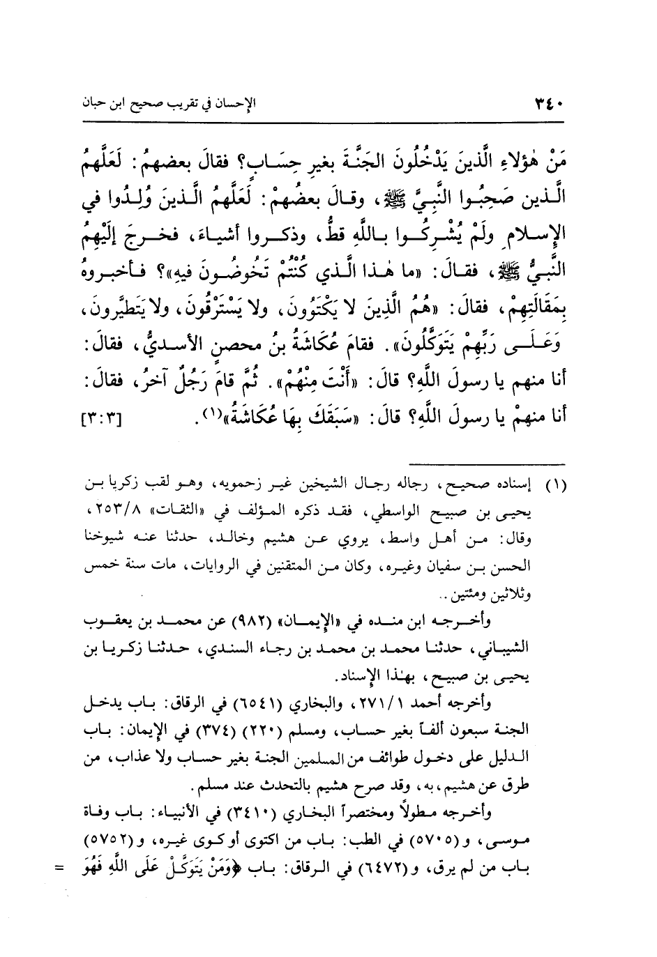 مَنْ هَؤُلَاءِ الَّذِينَ يَدْخُلُونَ الْجَنَّةَ بِغَيْرِ حِسَابٍ؟ فَقَالَ: بَعْضُهُمْ لَعَلَّهُمُ الَّذِينَ صَحِبُوا النَّبِيَّ صَلَّى اللَّهُ عَلَيْهِ وَسَلَّمَ، وَقَالَ بَعْضُهُمْ: لَعَلَّهُمُ الَّذِينَ وُلِدُوا فِي الْإِسْلَامِ، وَلَمْ يُشْرِكُوا بِاللَّهِ قَطُّ، وَذَكَرُوا أَشْيَاءَ، فَخَرَجَ إِلَيْهِمُ النَّبِيُّ صَلَّى اللَّهُ عَلَيْهِ وَسَلَّمَ، فَقَالَ: «مَا هَذَا الَّذِي كُنْتُمْ تَخُوضُونَ فِيهِ؟» ، فَأَخْبَرُوهُ بِمَقَالَتِهِمْ، فَقَالَ: «هُمُ الَّذِينَ لَا يَكْتَوُونَ، وَلَا يَسْتَرْقُونَ، وَلَا يَتَطَيَّرُونَ، وَعَلَى رَبِّهِمْ يَتَوَكَّلُونَ» ، فَقَامَ عُكَّاشَةُ بْنُ مِحْصَنٍ الْأَسَدِيُّ، فَقَالَ: أَنَا مِنْهُمُ يَا رَسُولَ اللَّهِ؟ قَالَ: «أَنْتَ مِنْهُمْ» ، ثُمَّ قَامَ رَجُلٌ آخَرُ فَقَالَ: أَنَا مِنْهُمُ يَا رَسُولَ اللَّهِ؟ قَالَ: «سَبَقَكَ بِهَا عُكَّاشَةُ» (1) . [3: 3]